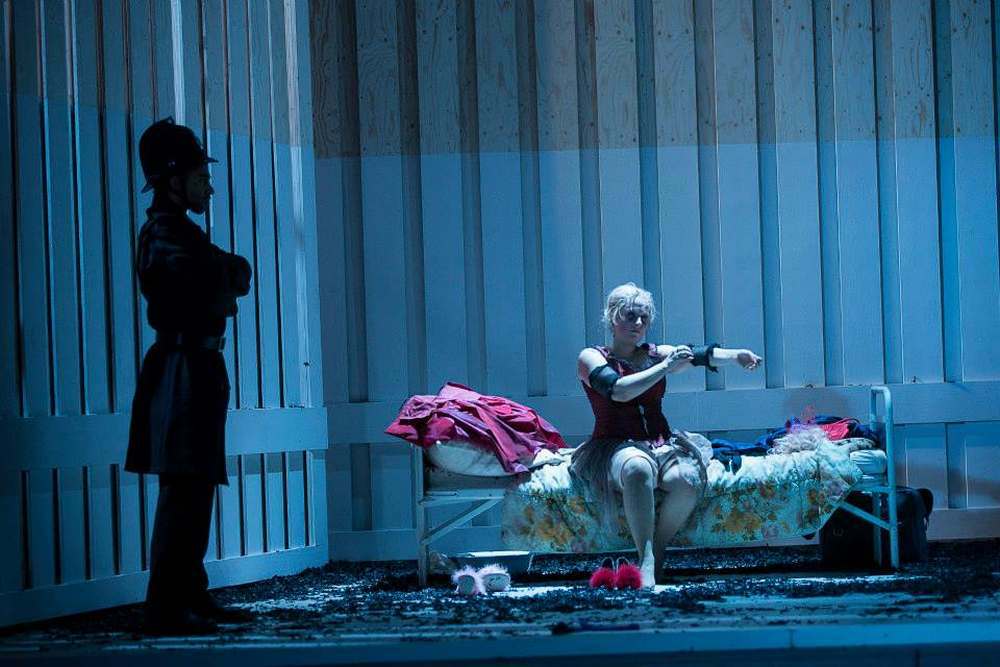 Nastudování je velmi vizuálně a režijně zdařilé. Jednoduchá scéna Mathise Neidharta z nemořeného, jen částečně nabíleného dřeva, vytvářejícího plotový rastr, a s proměnlivou zadní stěnou, umožňovala rychlé proměny. Tuto výtvarnou čistotu doplňoval jen malý počet mobiliáře (postel). V kontrastu s čistotou a univerzalitou scény tvůrkyně kostýmů Sibylle Gädeke využila kombinací obnošených i nových textilních a kožených materiálů v různorodou směs, jejíž účinek posílila opakováním téhož materiálu na různých postavách nebo použitím totožného materiálu na kostýmu a zároveň zařízení scény (například závěsy). V některých kostýmech nalezneme také odkazy na současnou popkulturu, například kostýmy Kitty upomínají na kostýmní kreace Cindy Lauper. Tak jak příběh spěje k tragickému konci, vězeňské scény se utápějí v bezútěšné šedi. Zkušený činoherní i operní režisér Jens-Daniel Herzog, který mě kdysi pobavil gagy v Händelově opeře Giulio Cesare in Egitto v Semperoper v Drážďanech, dobře vystihl záměry skladatele a libretisty. Určitá zkratkovitost v jeho režijním rukopise není od věci a nepřipraveného diváka rád uvádí přímo do situace. Velmi dobrým nápadem je neustále padání popela, které jednak symbolizuje zkaženost velkoměsta a také syfilitickou nákazu, která ulpívá na tělech protagonistů příběhu, pak se mění v šankrové vředy na obličeji Moll. Režisér také akcentoval sexuální a násilnické momenty libreta. Moll je na scéně dvakrát znásilněna, vícekrát souloží s různými náhodnými partnery, ve vězení nalezneme pár mazlících se lesbiček, na Mollině tryzně několik mužů „žertovně“ předvádí frikční pohyby na bedně s jejím mrtvým tělem a Lovelace odmítá jasné nabídky k orálnímu sexu od Molliny nástupkyně. Stejně tak hojně je zastoupeno násilí mezi muži nebo útlak v ženském vězení pro nevěstky. Celkový záměr režiséra se blíží současnému kritickému proudu exploatace ženy jako sexuálního zboží.+++===Premiéra opery měla společenský ohlas, který jistě takovémuto dílu a příležitosti náleží. Teprve další reprízy a nastudování mohou rozhodnout o budoucnosti díla a prokázat jeho životnost v repertoáru. Přesto si musíme položit otázku, kterou si klademe při každé světové premiéře soudobé opery, zda má dílo vůbec v současném divadelním provozu šanci. A Harlot´s Progress disponuje atraktivním námětem pro anglicky mluvící jeviště. Hudba není příliš osobitá a jistě by jí prospěly úpravy například v orchestraci. Uvedení limituje vokální a herecká náročnost hlavního ženského partu i nutnost obsadit ostatní role kvalitně zpívajícími herecky schopnými představiteli. Určitou šanci na přežití díla dává možnost uvádění jako luxusního nebo festivalového dvojprogramu, snad by se mohl nazvat „hogarthovský diptych“, ve spojení se Stravinského The Rake´s Progress. To ostatně učinilo i Divadlo Na Vídeňce, když v září tohoto roku znovu nastudovalo velmi úspěšnou inscenaci v režii Martina Kušeje. Pro srovnání obou děl bych doporučoval ale opačné pořadí oper, aby divák odcházel s lepším hudebním uspokojením.