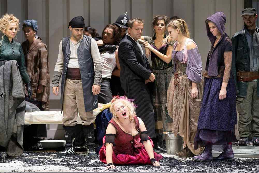 Bellova hudba se odvolává na anglické klasiky dvacátého století, především na hudbu Benjamina Brittena. S Brittenovým Peterem Grimesem ji ostatně spojuje obdobná stavba díla. I orchestrální mezihry by po malé úpravě mohly vytvořit svitu k opeře jako v případě Brittenových Mořských meziher. Bohužel, ač zvukový materiál se Brittenovi blíží, je nápadově chudší a partitura především trpí přílišně silnou orchestrací. Místy orchestr překrýval sólisty až k úplné nesrozumitelnosti. Mimoto nadužívání bicích nástrojů, především koncertních zvonů a bubnů, opakovaně určujících rytmus například sexuálních aktů na scéně, působilo únavně a monotónně. V závěru opery chtěl skladatel vytvořit velký monolog šílené Moll, srovnatelný se scénou šílenství Lucie di Lammermoor (mimochodem jedno z parádních čísel Diany Damrau). Délkou se mu to určitě podařilo, což komentoval polohlasem a úlevně kultivovaný vídeňský divák v řadě za mnou „… endlich stirbt!“. Tento výjev se zdá spíše uměle prodlužovaný, přes ojedinělou citaci z kadencí šílené Lucie, posluchače citově neangažuje. Podle prohlášení skladatele v informačních materiálech dalším protagonistou opery je sám Londýn. Bohužel nepodařilo se mi v hudbě vysledovat něco, co by připomnělo Londýn jako město nebo jeho (hudební) historii. Snad jen počáteční sbor pouličních obchodníků a spodiny připomene Sondheimův operní muzikál Sweenney Todd.Druhou osobností, bez které by opera asi vůbec nevznikla, je koloraturní pěvkyně Diana Damrau. Pro ni skladatel již zkomponoval dva cykly písní s klavírem a další cyklus orchestrálních písní. Právě její osobní angažovanost a citové nasazení v roli zachránilo mnohé během premiérového večera. Výborný herecký výkon, s velmi odstíněnou paletou od nevinnosti ke koketerii až po syfilitické šílenství, bez přehánění a naturalismů, velká tělesná pohyblivost i bravurní zvládnutí nelehkého pěveckého partu si oprávněně zasloužilo dlouhé ovace publika. Part je opravdu napsán na míru této koloraturní zpěvačce, která zasahovala jak do libreta, tak do kompozice během psaní opery, a skladatel komponoval její part (především tessituru role) tak, aby maximálně vyhovovala současnému stavu hlasu. Damrau má ostatně dostatek zkušeností s moderním repertoárem, v minulých letech vytvořila také hlavní roli v poslední Cerhově opeře.