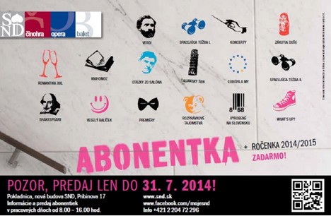 Slovenské národné divadlo už predáva abonentky na nadchádzajúcu sezónu 2014/2015. Výhradne v pokladnici novej budovy SND si záujemcovia môžu vybrať z rozšírenej ponuky abonentných balíčkov.Abonentky sú lacnejšie ako bežné vstupenky (úspora v priemere 20 %), garantujú stále miesto v hľadisku a ich výhodou je aj osobná starostlivosť vybraným pracovníkom Oddelenia predaja SND. Keďže nasledujúca 95. divadelná sezóna je jubilejná, naša prvá scéna každého držiteľa novej abonentky odmení aj publikáciou Ročenka SND 2014/2015, ktorú dostane zadarmo.