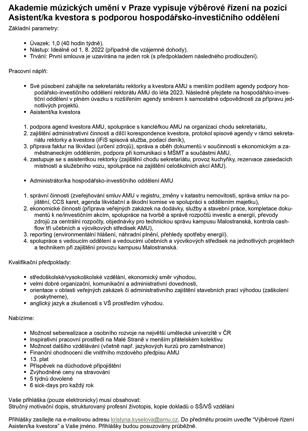 AMU vypisuje výběrové řízení na pozici Asistent kvestora s podporou hospodářsko-investičního oddělení