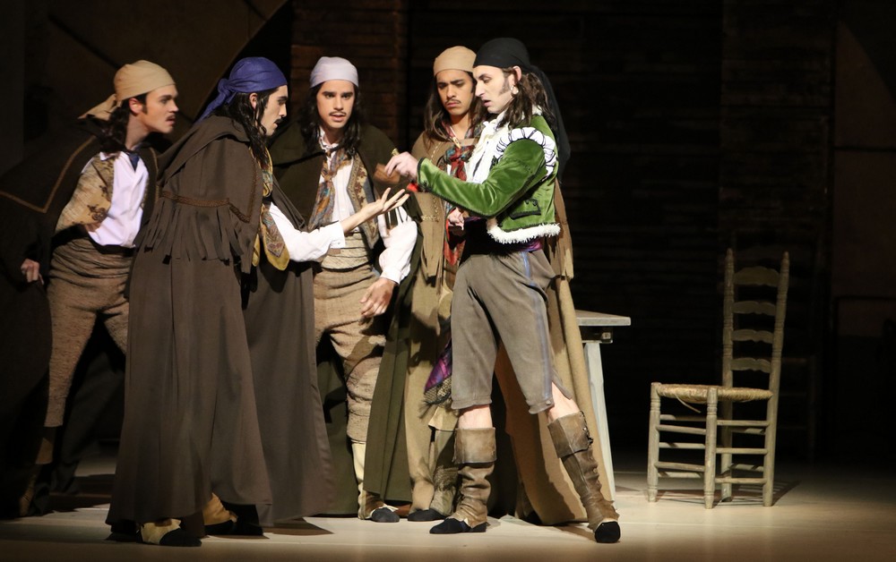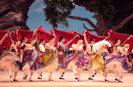Ratmansky si prizval k spolupráci svojho dvorného výtvarníka Jérômeho Kaplana, s ktorým výhradne pracuje už niekoľko produkcií. Kaplan sa snažil vystavať na scéne realistické priestory, ale z neznámeho dôvodu sa mu to nedarí úplne. Či je na vine rozpočet, či iné dôvody nie je zreteľné. Jeho snaha po realistickej rokline (1. dejstvo), ktorú však tlačia dolu štylizované výkryty predstavujúce oblohu, zostáva nedotiahnutá do konca. Druhé dejstvo v krčme vychádza zo známych historických snímok podobných priestorov a rovnako ako prvé dejstvo je silne členité do výšky. V rokline dominuje lavička, ktorou prichádzajú cigáni a z vrchu zostupujú dolu, tu zase mohutné schodisko delí scénu do vertikály. Tretí obraz v sále d´Hervillovcov sa snaží o citáciu maurskej španielskej architektúry a empíru s výhľadom na mesto, ale farebne v kombinácii hnedej omietky a bielych stropov pôsobí cudzorodo. Efektné je odtiahnutie závesov, ktoré predlžujú priestor do panoramatického pohľadu na mesto na druhom brehu rieky a opäť balkón, z ktorého potom dolu pozerajú deti z mazúrky. Celkovo však chýba snaha po detaile a drobnokresbe i precíznosti.