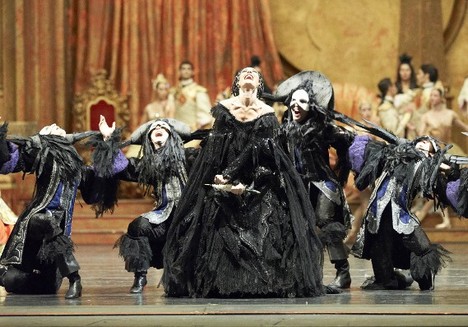 Z tohto vychádza vzrušujúci motív svetla. Celá scéna odráža matný lesk a žmurkajúce svietniky obrovských rozmerov ožarujú scénu Prológu a všetkých prichádzajúcich v extravagantných chorovodoch a nástupoch neustále sprevádzajú lokaji so svietnikmi. Keď láska zvíťazila nad smrťou a sto rokov uplynulo, sme svedkovia slávnostného osvetlenia paláca krištáľovými lustrami. Doba, rozum víťazí. Možno aristokratické cnosti a potuteľné tete a tete za svitu sviečok skončili a i keď láska slávi svoj triumf, už nič nebude také mystické, pretože všetko ožiari ľudský duch stelesnený pokrokom a rozumom. Staré poriadky nahradia nové. Manželia sú viac než kráľovským párom dynastie, sú sympatickými mladými ľuďmi, ktorí zavedú nové poriadky. Zaujímavý detail aj s ohľadom na to, že meno hlavnej hrdinky Aurora znamená zornička. V odtieňoch zlata a teplých farieb sú koncipované aj prepychové kostýmy, ktorým reprízy trochu ubrali, ale aj tak sú plné invencie, efektne ilustrujú pohyb interpretov a sú dotvorené excentrickými účesmi. Pompa inscenácie to sú vlajkonosiči so zlatými zástavami a insígniami moci, deti ako pážatá, ktoré neustále prenášajú symbolické artefakty venované vílami novorodencovi. Vrcholom pompy je trón, ktorý na ramenách nosia pochopy Carabosse a tá z dobrých dvoch metrov v čiernej barokovej róbe prichádza zvestovať smrť.