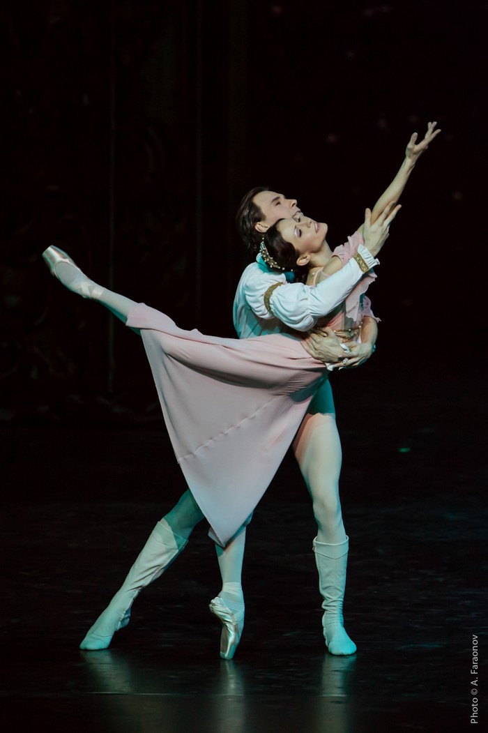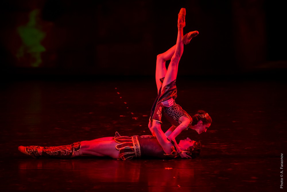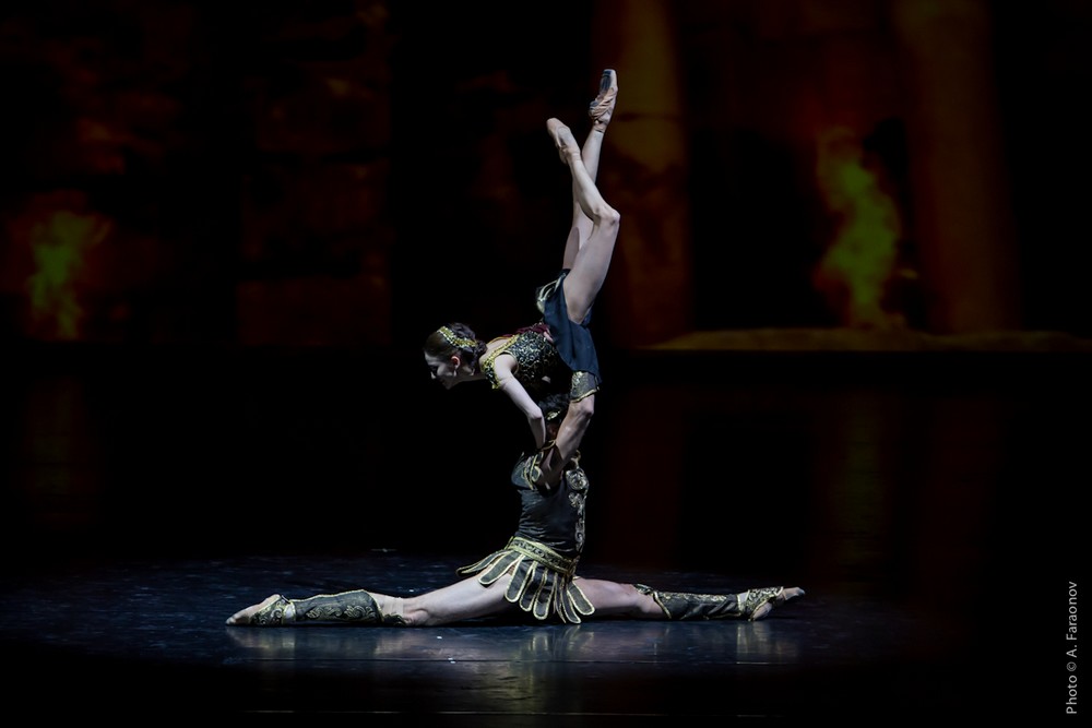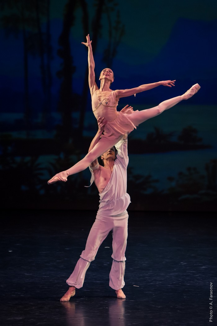 ===Druhé významné divadlo Petrohradu Michajlovské, vyslalo Sabinu Yapparovú s Maratom Shemiunovom, ktorí zatancovali extravagantné, i českému divákovi z minuloročného gala v Brne známe, adagio z baletu Spartakus z vlastnej produkcie v choreografii Georgyho Kovtuna. Toto excentrické dueto, ktoré hraničí s akousi postklasikou, ktorá je spojená s osobitou tanečnou schopnosťou partnerov prekročiť hranice gravitácie a zájsť až do akrobacie, má jedinú nevýhodu, že je také krátke. Je vzrušujúcou ochutnávkou, ako by milostná predohra medzi Aeginou a Crassusom pokračovala. Ako radi by sa diváci v hľadisku stali voyermi a pozorovali, ako postupne po tom, čo odhodili zábrany a spojili svoje telá v erotickom tanci, v ktorom dominujú choreograficky opulentné zdvíhačky, by odhodili šaty a dospeli k spoločnému vyvrcholeniu. Pár sa predstavil ešte v allegrovom, éterickom duete, ktoré program neuvádzal (a niektorí si to možno ani nevšimli) Leťte holuby Stanislava Vlasova. Možno povedať, že už skoro od bývalého šéfa Michajlovského divadla Nacha Duata, predviedli iné vášnivé číslo z baletu Multiplicity: Violoncello. Režijný nápad dueta, využiť fyzické dispozície Shemiunova a urobiť z neho hráča na violoncello, ktoré predstavuje obratná a plastická Yapparova, je skvelý. Bohužiaľ, choreograf ho už ďalej nerozvinul a vytlačil zo seba režiséra, ktorý dobrý nápad rozvedie do divadelnej plastickosti a účinnosti. A tak i keď Yapparova predvádza celé kadencie pohybov sa choreografia stáva únavnou a nevedie nikam, len sa varíruje dookola ako sforzata hudby.+++