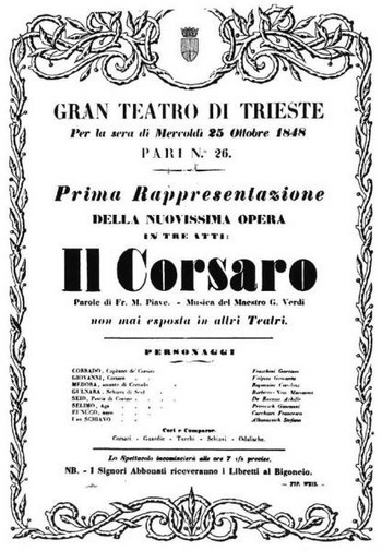 Je to škoda, lebo aj sobotné koncertné uvedenie Verdiho vyslovene raritného diela Il corsaro (Korzár) sa mohlo stať – ak už nielen zážitkom čisto hudobným a speváckym – aspoň materiálom „výskumným“ pre odbornú pedagogickú, akademickú, divadelnú a študentskú obec. Skrátka pre profesionálov i laikov. Ale koho by už u nás trinásty operný opus jubilujúceho maestra z Busseta, skomponovaný v záverečnej etape „raného“ obdobia, zaujímal. Keď Opera SND ide sláviť výročie Rigolettom, tak „dáky ten Korzár“ je plodom bujnej fantázie dramaturga… asi tak dáko uvažuje „bežný“ slovenský divák. Niet sa čím chváliť.Isteže, Korzár nepatrí k najdokonalejším skladateľovým opusom, no nájdeme v ňom mimoriadne cenné hudobné čísla a v štýlovo presnej a veľkými hlasmi podopretej interpretácii sa možno nabažiť pravým verdiovským belcantom. Il corsaro mal premiéru v Terste v októbri roku 1848, v čase keď Gioachino Rossini komponoval už len príležitostné skladbičky (v tom čase to bol hymnický zbor Coro della Guardia Civica di Bologna, ku ktorému napísal len sólové party, zatiaľ čo orchestráciu zveril Domenicovi Liveranimu) a Gaetano Donizetti bol pol roka po smrti. Tridsaťpäťročný Verdi mal za sebou dvanásť opier, poslednou bola pre Paríž prepracovaná verzia Lombaďanov, nanovo nazvaná Jérusalem. V hlave mu vírila nielen Bitka pri Legnane, ale najmä prvú tvorivú periódu uzatvárajúca Luisa Miller. Sám sa na svojom tertskom debute nezúčastnil, no pre toto divadlo pripravil ešte pred Rigolettom, Stiffelia.