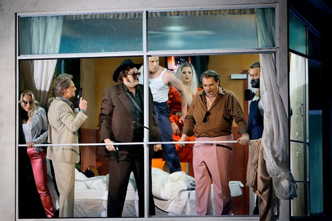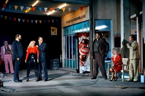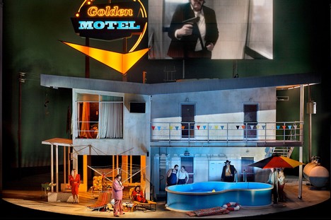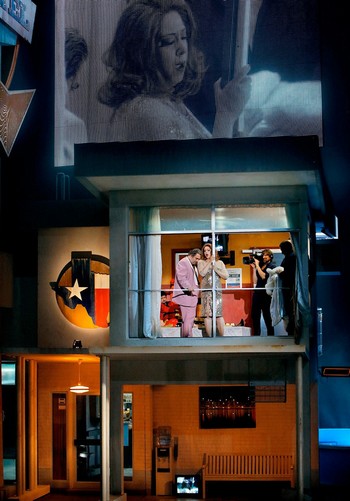 Upoutává především technika. Na střeše motelu je screen, vidíme live dění na jevišti jako při rockovém koncertu nebo fotbalovém přenosu. Kameramani zachytí každé gesto zpěváků, a občas se tak zprostředkovává až děsivá dynamičnost.