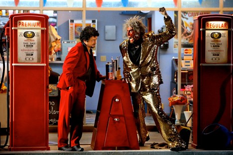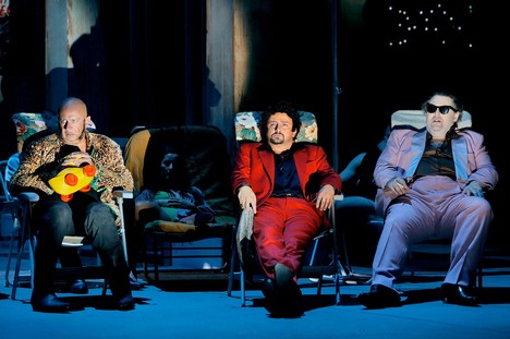 Proti vulgárnímu pošetilci stojí zpustlý svět bohů. Wotan je sukničkář v růžovém smokingu, hned na začátku leží v posteli s Frickou i Freiou (a později svádí Eerdu). Loge je jako postava z Tarantinova Jackie Browna, v rudém obleku a s černou parukou. Donner a Froh vypadají jako vysloužilí westernoví hrdinové (Oleksandr Pushniak Donnera tak bohužel i zpívá). A obři přicházejí k benzinové pumpě jako automechanici v tričkách a baseballovými pálkami rozmlátí interiér.