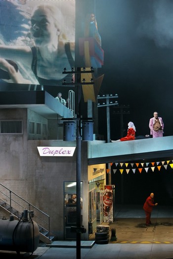 To, že Wotan s Erdou splodí valkýry, Wagnerovo libreto nespomína. Ide tu však o jednu zo skrytých motivácií konania figúr, ktoré niekedy náznakovo, inokedy explicitne zaznejú vo forme modulácií jednotlivých leitmotívov. Tento geniálny kompozičný hudobnodramatický prístup inscenuje Castorf pomocou filmových sekvencií premietaných na obrovský billboard zakomponovaný do scénickej stavby motela. Ako reklamná plocha alebo strieborné plátno autokina atakujú zdvojenou, paralelnou, alebo pantomimickou akciou pozornosť publika. Tam kde necháva Castorf spievať akoby neinvenčne na rampe, tam sa presúva dráma do biografu na plátne. Kameramani neustále sa pohybujúci pomedzi postavy na fantasticky detailnej, no nikdy nie preplnenej a účelovej scéne Aleksandara Denica snímajú mimiku aktérov. Ich intímna vnútorná dráma je tak v prestrihoch s fiktívnymi filmovými sekvenciami prenášaná do popredia javiska. Filmové pasáže týmto spôsobom vynikajúco osvetľujú skryté motivácie postáv na jednej strane (už spomínaná kúpeľňová scéna Erdy a Wotana, ktorá sa odohráva v útrobách scénickej stavby, do ktorej divák preniká len skrz filmové plátno), na druhej strane by sa dali chápať ako kritika mediálneho ošiaľu, ktorý Castorf chápe ako cynickú chiméru pachtiacu po stieraní hraníc intimity. A to je jeden z dôvodov, prečo Castorfova intencia nenudí. Wagnerovu kritiku kapitálu totiž rozširuje o aspekt mediálnej kritiky. Nielen nafta a benzín, ale aj (emocionálna) pornografia nových médií sú novým zlatom – mocnou zbraňou v rukách bezcharakterných novozbohatlíkov bez vkusu a morálnych zábran.Pri premiére v roku 2013 bolo Castorfovo mediálne „blízke stretnutie tretieho druhu“ s často neúprosným a konzervatívnym publikom v Bayreuthe absolútnym kameňom úrazu. Po poslednom predstavení sa však zdá, že publikum začína prijímať aj túto verziu Wagnerovho mýtu. Bučanie zaznelo len zriedka, rozhorčených prestávkových extempore ubudlo. Presne ako v prípade legendárneho „Prsteňa storočia” Patrice Chereaua, ku ktorému má Castorfova spoločenskokritická optika rozšírená o mediálnu kritiku vo forme samplingu popkultúrnych ikon filmovej estetiky podozrivo blízko.