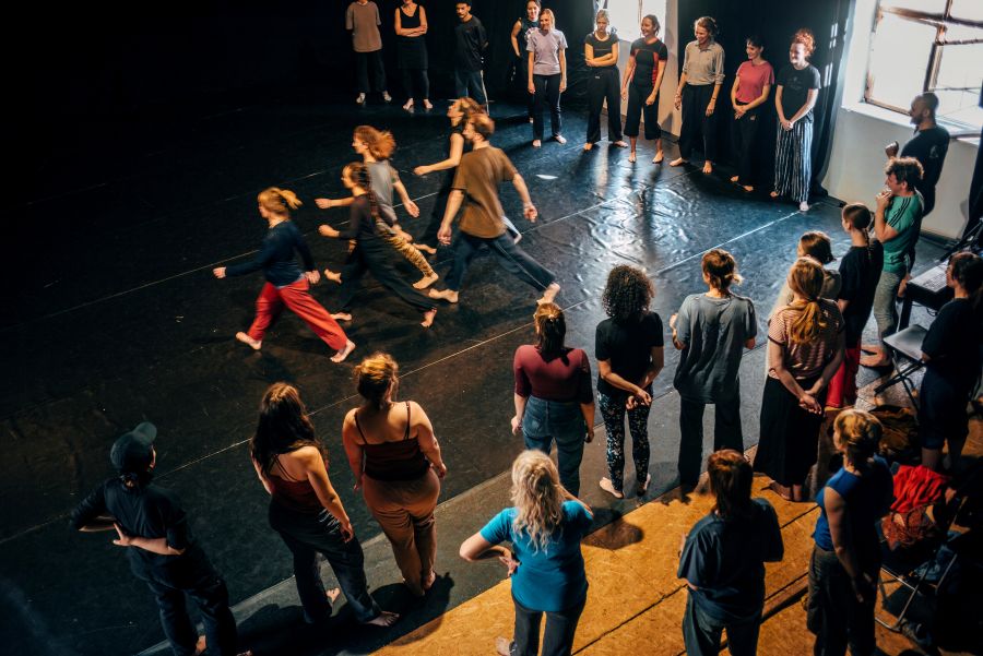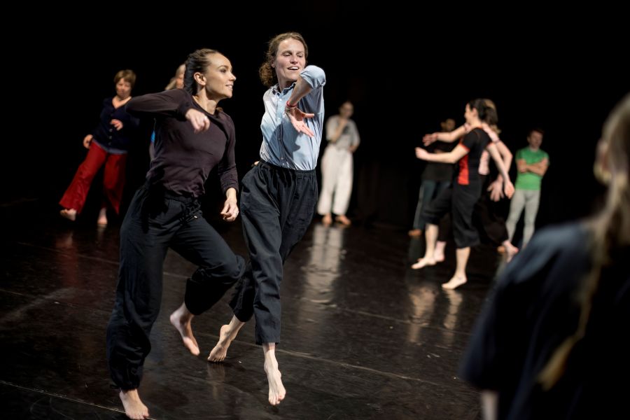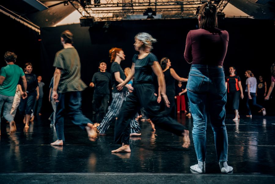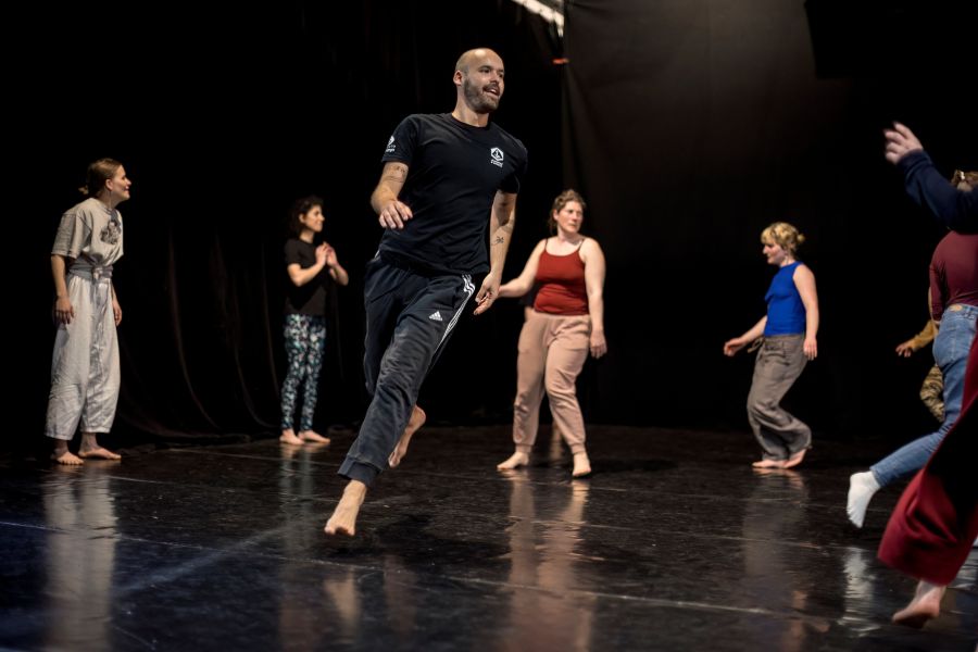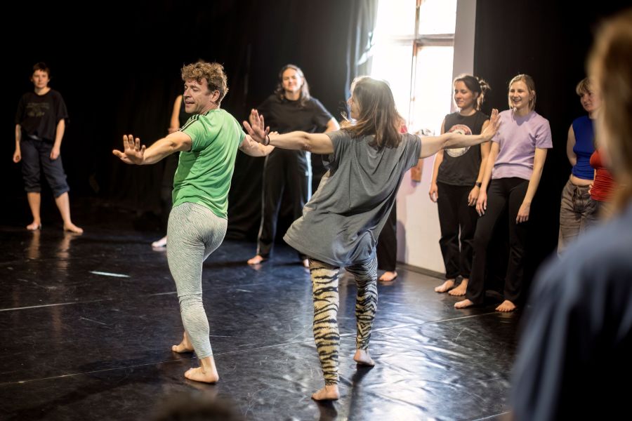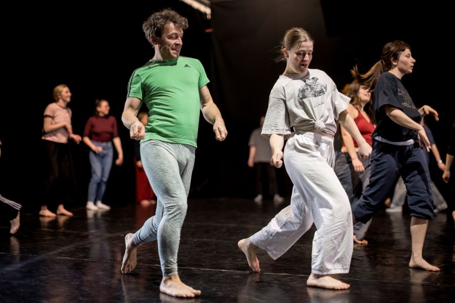 Aleksandar Georgiev: Folklor pro mě nutně neznamená konkrétní národní tradici, ale spíš způsob sdíleného pohybu – něco, co je přístupné, komunitní a kolektivní. Ne tolik reprezentace konkrétních národních identit, ale spíš otázka: Jak by mohl vypadat queer folklor? Tedy folklor, který by mohl vzniknout v queer komunitě, pokud bychom si mohli vytvářet své vlastní tradice. A ty by musely být inkluzivní – neelitářské, ale jednoduché, otevřené, přístupné každému, kdo se s nimi chce ztotožnit. Proto používáme chůzi, poskoky, společné opakování gest – pohyby, které zná tělo intuitivně. Tenhle přístup je v celé trilogii přítomný jako forma „kinetického folkloru“.
