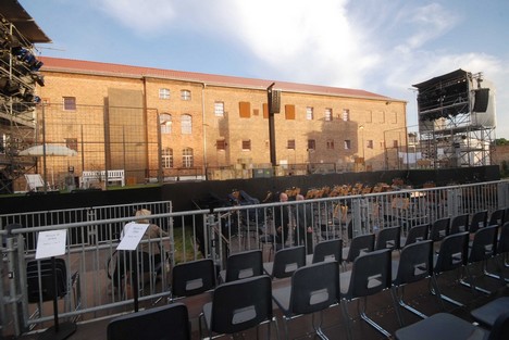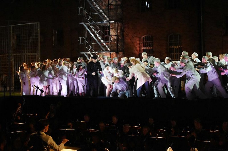 Pak už jen stačí okruhem projít kolem jedné z budov a vystoupat na rozsáhlou tribunu o tisíci místech. Otevře se vám pohled na poměrně úzké, ale hodně široké jeviště, na jehož pravé i levé straně jsou jakési zamřížované vysoké klece. V té vlevo je zahrádka s trávníčkem a lehátkem. V pravé je jakýsi obytný dvoreček, kde Marzellina, dcera žalářníka Rocca, rozvěšuje prádlo a koketuje se svým nápadníkem Jaquinem. Vpředu před jevištěm je v nižší poloze umístěno velké orchestřiště. Pozadí pak tvoří rozsáhlá cihlová budova se třemi patry zamřížovaných oken, za nimiž byly umístěny vězeňské cely.