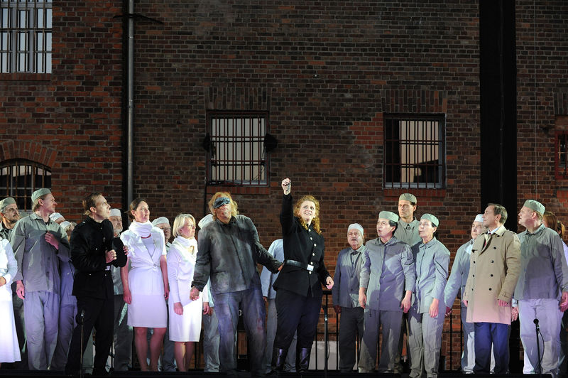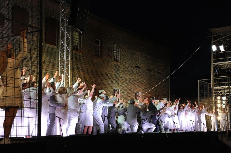 Z poměrně vysoké tribuny je zřetelně vidět na levou stranu vstupního nádvoří s branou, kde paralelně s dějem probíhají nástupy a akce čet ozbrojených strážců. Velmi emocionální je třeba příjezd zamřížovaného originálního vozidla Barkas (tyto mikrobusy jsme potkávali na východoněmeckých, ale i našich silnicích), které přiváží nové vězně, aby v samém závěru opery odvezlo sesazeného a ihned zatčeného ředitele věznice Pizarra.