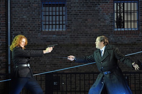 Pro zkušeného režiséra a intendanta zdejšího divadla Martina Schülera (má za sebou okolo jednoho sta režijních prací, včetně Fidelia v Chotěbuzi před sedmnácti lety) to byla jistě velká výzva a je nutno konstatovat, že se jí zhostil výtečně. Bylo to samozřejmě za výrazné spolupráce scénografa Hanse-Holgera Schmidta, který zejména v druhé půli představení po setmění využil promyšleného svícení i videoprojekcí. Velmi sugestivně třeba působí ve třetím obraze vnitřní prosvícení skoro všech zamřížovaných oken se siluetami za nimi umístěných živých postav vězňů. Zajímavé je i připoutání Florestana čtyřmi pružnými natahujícími se lany upevněnými na kladkách bočních věží (jistě to nebylo pro pěvce při zpěvu moc komfortní).