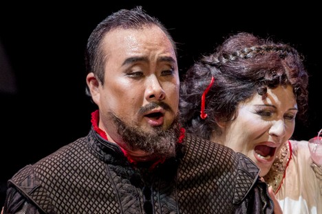 Kriesenie neznámych opier, navyše v tentokrát určite z Donizettiho odkazu najvydarenejších, potrebuje určité záruky. Nota bene v belcante sú to speváci. Momentálna situácia v Taliansku nie je vonkoncom ideálna (je to pravdepodobne kombinácia istej vokálnej aj ekonomickej krízy) a to potvrdilo rovnako augustové Rossiniho Pesaro ako aj Donizettiho Bergamo. Tendenciu ústupu z kvality je zjavná. V novej inscenácii sa strekla takpovediac druhá liga. Najväčšia zodpovednosť v Torquatovi Tassovi je na predstaviteľovi titulnej postavy. Juhokórejský barytonista Leo An (poznáme ho z vlaňajšieho bratislavského naštudovania Rigoletta) si rozumne rozložil sily tak, aby tretie dejstvo, ktoré je už len v jeho rukách, dokázal vokálno-technicky zvládnuť a výrazovo vygradovať. Vcelku sa mu to podarilo, aj za cenu kolísavých miest v prvých dvoch dejstvách, kde neupútal ani osobitou farbou a objemom materiálu, suverenitou vyššej polohy či emotívnosťou výrazu.