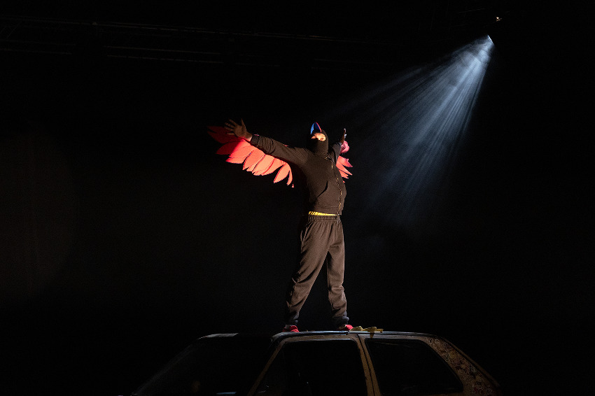 Uprostřed scény stojí staré zrezivělé auto, které vypadá jako hračka v životní velikosti, a vzduchem se nese zpěv ptáků. Jakmile se světlomety rozblikají, za zvuků maniakální rozhlasové montáže hudby a internetových hitů (skvěle namíchaných Dunkem Murphym) se v okně auta objeví hlava chlapce. Hoch v podání Kévina Coquelarda s tekutou odevzdaností bezděčně padá dovnitř a ven z auta, tančí, provádí nejrůznější akrobatické kousky a synchronizuje své rty se slovy, zatímco ho končetiny táhnou od jednoho pádu k druhému. Auto je zároveň truhlou na hračky, v níž tanečník nachází barevné ponožky či neidentifikovatelné plastové objekty, které vypouští na jeviště. Je to bunkr, jaký si stavějí děti, aby v něm ukryly své nekonečné fantazie, útočiště před zbytkem světa, kamarád s tlukoucím srdcem (v podobě zvukové nahrávky) a dvěma světlomety místo očí. Při sledování Birdboye se v nás znovu probouzí ten dětský pocit, jsme obklopeni kouzly a neomezenými možnostmi fantazie, přinejmenším Kévinzjevně obývá svůj vlastní svět, kde po každém pádu přichází další let. Nacházíme se někde v chlapcově mysli. Jeho soukromé deníky o šikaně a odcizení nám postupně zprostředkovávají nahrávky a jeho sny ožívají prostřednictvím jím nápaditě inscenované stínohry. Problémy dětství a dospívání přicházejí rychle a bez většího varování, a když nám připadá, že najít své místo ve světě je nemožné, stane se, že nejlepším východiskem se nám zdá uzavřít se a zmizet ve vlastní hlavě, což dělá právě i Kévin Coquelard v roli Birdboye.