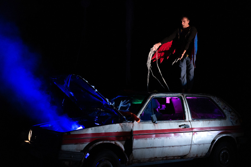 V jeho vnitřním rádiu hrají písně o osamělosti či virální internetové hity (např. Nyan Cat), ale zaznívají i hlasy inspirativních řečníků, jako je britský přírodovědec a popularizátor David Attenborough ad. Zpočátku Coquelardůvvtipný zpěv a imitace nahrávek udržuje odlehčenou náladu, stejně jako jeho atletické manévrování v rozbitém autě a všude kolem něj. Choreografka Emma Martin však pracuje i s cizí emocionální odezvou, a když se vedle stínové loutky našeho mladého hrdiny objeví slovo „podivín“ („weirdo“) a zazní hrubá slova o nedostatku přátel, z publika vyzařuje hmatatelný soucit. Stínohře je věnován levý roh zadního plánu scény a absolutní absence jiné akce v této oblasti po celou dobu trvání choreografie sice potrhuje její důležitost pro celý příběh (pokud to bylo záměrem choreografky), ale zároveň se stává až zbytečně nevyužitou z hlediska prostorového rozložení choreografie.