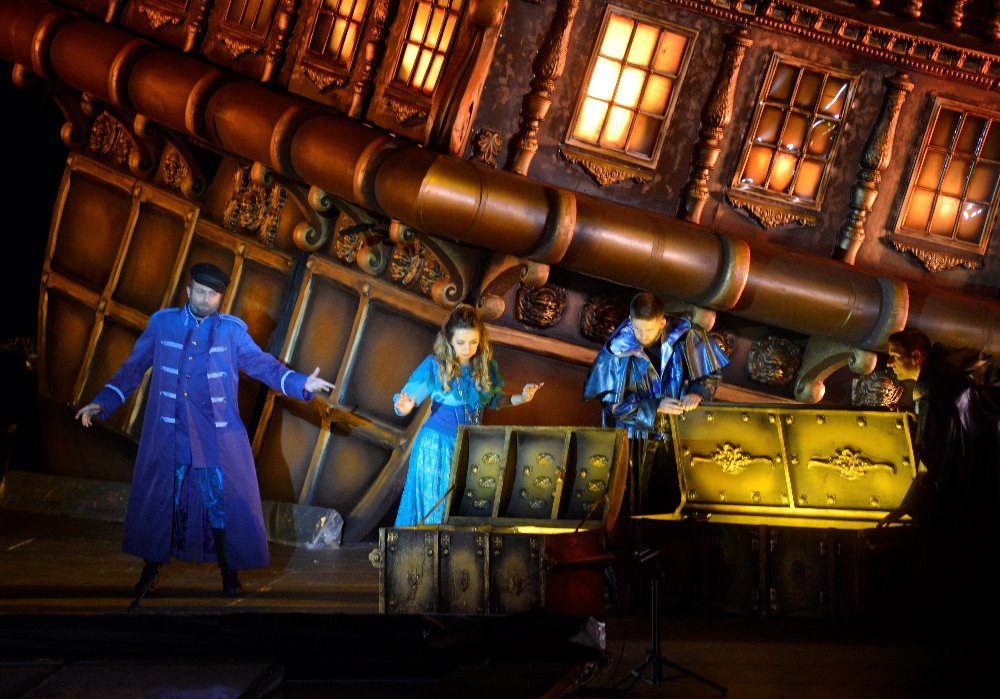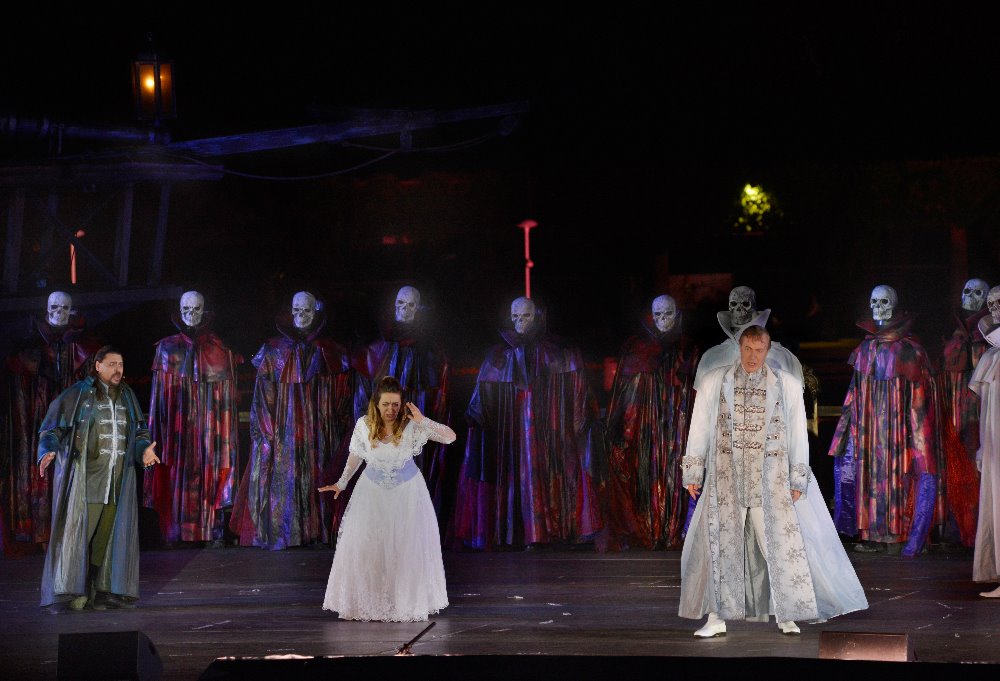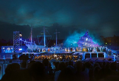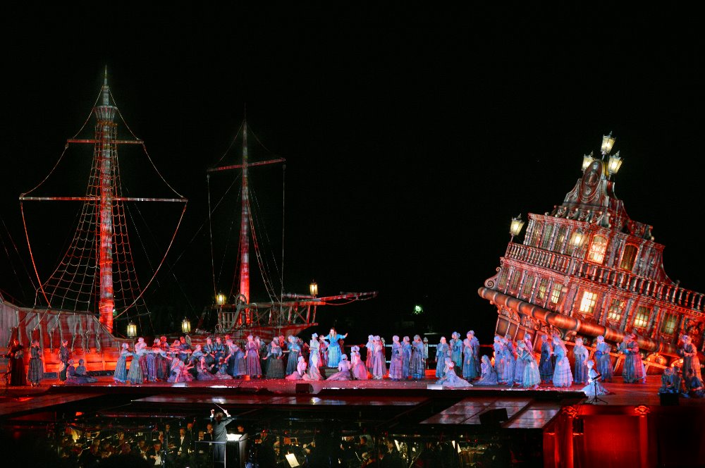 V slezské Wroclawi mají dobrou praktickou zkušenost s operními velkoprodukcemi v interiéru velké, takzvané Haly století. Ta je umístěna v areálu, ve kterém se nachází i jeho část s umělým jezerem o ploše jednoho hektaru, s fontánami nazývajícím se Pergola.Tyto fontány mohou stříkat velmi vysoko a lze je tedy scénicky využít, jak se stalo před lety například při uvedení Donizettiho Nápoje lásky. V letošním červnu tento prostor posloužil k postavení smělé a výpravné dekorace nad přední částí vodní hladiny. Úplně vpředu pod úrovní jeviště byl umístěn orchestr, který je možno překrýt při eventuálním dešti; ovšem nakonec při žádném z šesti představení včetně toho posledního naštěstí nepršelo. Na břehu byly postaveny dvě velké hledištní tribuny pro skoro tři tisíce diváků.Původně se přitom mělo představení hrát na nedalekém zámku Topacz, kde byl v loňském roce úspěšně uveden Verdiho Rigoletto. Nakonec se ale zjistilo, že tamní jezírko by pro inscenování opery nebylo vhodné, a tak nakonec volba padla na Pergolu.