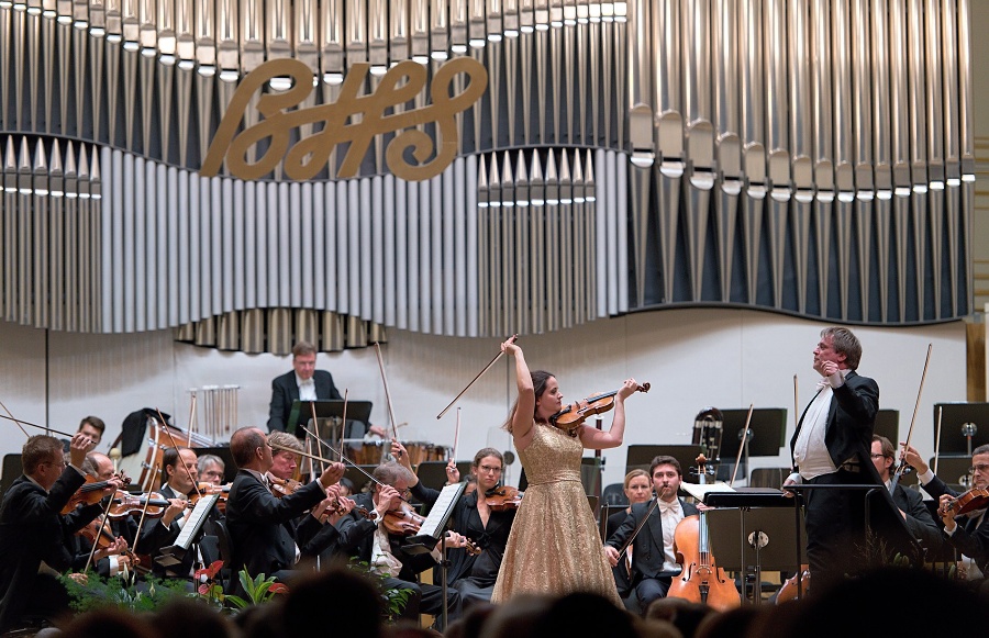 Prvú polovicu koncertu tvorila u nás neznáma Serenáda podľa Platónovho Symposia pre sólové husle, sláčikový orchester, harfu a bicie nástroje od Leonarda Bernsteina. Približne polhodinový opus pochádza z roku 1954 (premiéra sa odohrala v benátskom Teatro La Fenice) a má – čo vyplýva z nástrojového zloženia – skôr komornejší charakter. Opiera sa o literárnu predlohu, Symposium od antického gréckeho filozofa Platóna. Už samotná téma predznamenáva netradičnosť v spracovaní, reflexiu myšlienkovej podstaty jednotlivých častí, zložených z prejavov a dialógov Faidrosa, Aristofana, Eryximacha, Agathona a Sokrata. Leonard Bernstein hudobne pretavil rozmanité variácie na námet erotiky a lásky. Opäť dokázal, dokonca na poli odlišnom, než tvorí jeho najširšie známu vizitku, že bol majstrom nápadov, vynaliezavej melodiky a rafinovanej inštrumentácie. A samozrejme, že vedel pracovať s textom, s obsahom. Sólistka serenády, lotyšská rodáčka a v Nemecku žijúca Baiba Skride, sa vnorila do partitúry s technickou brilantnosťou, dynamickou tvárnosťou tónu, schopnosťou viezť rovnocenný dialóg so sláčikovou sekciou orchestra i sólovým violončelom. A v neposlednom rade s prirodzeným ženským šarmom. Celkový tvar skladby vystaval a do najjemnejších detailov vo výraze, dynamickom tieňovaní (jemné „pradenie“ sláčikov, pregnantná sekcia bicích) a reflexii obsahu zabezpečil 54-ročný fínsky dirigent John Storgårds. Bolo to prvé, no nezabudnuteľné stretnutie s týmto umelcom.