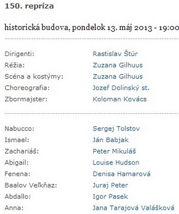 Rovné půldruhé stovky repríz se dnes dočká ve slovenské metropoli inscenace Verdiho Nabucca v režii Zuzany Gilhuss, aby na podzim vstoupila už do své patnácté sezony v repertoáru Slovenského národního divadla.Obsazení dnešního večera je slibné, ostatně posuďte sami: