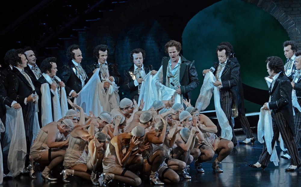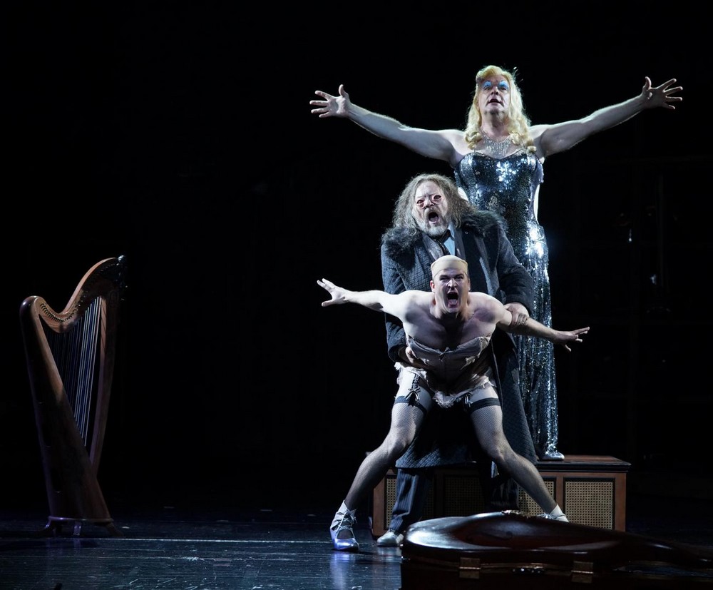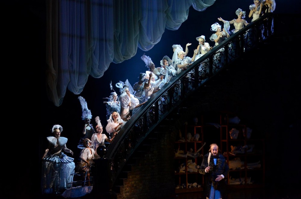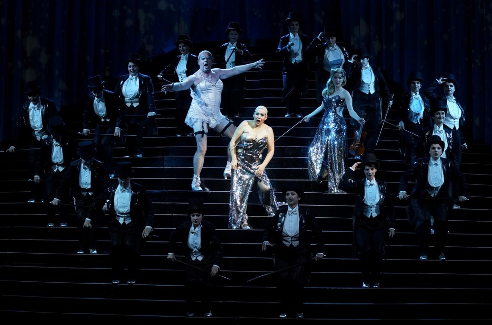 Vlevo páni – jsou to ale ve skutečnosti dámy, odhalující své „půvaby“ v korsetech a černých síťovaných punčochách s podvazky (kostýmní výtvarnice Esther Bialas), mezi nimi se k údivu publika po schodech zřítí zpěvačka Stella v korzetu a s holou hlavou, představovaná hercem – kaskadérem Pär Karlssonem. Zkrátka úplný transvestita. Z hlediště se ozývá rozzlobený hlas urostlého diváka, pohoršeného takovým cirkusem, vzápětí tento muž vnikne na jeviště, kde se z něj nevyklube nikdo jiný, než rada Lindorf, ztvárněný výborným německým barytonistou Michaelem Vollem, s velkým zvučným hlasem a navíc s výbornou francouzskou výslovností. Zpívá také role Copéllia, Doktora Miracla a kapitána Dapertutta. A také se někdy objevuje oblečen v dámském korzetu.