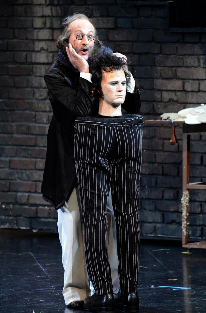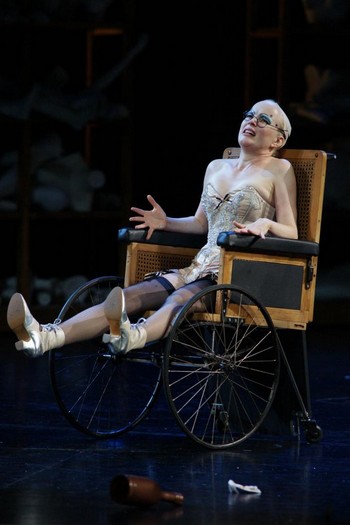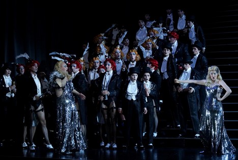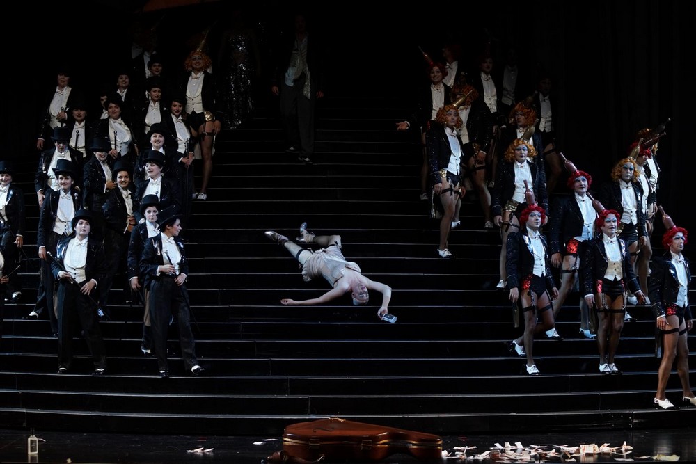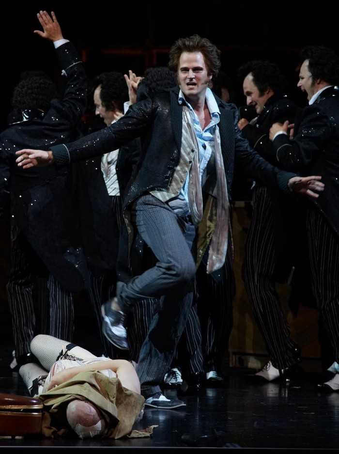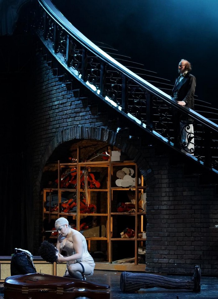 Po tomto divokém úvodu začíná první dějství. Z rozdováděné skupiny studentů v Lutherově vinném sklepě v Berlíně se oddělí mladý muž úplně stejně oblečený jako ostatní a na prosbu všech začne zpívat známý popěvek o malém skřetovi. Ano, je to Hoffmann, veselou písničku Klein Zack procítěně a znělým hlasem zpívá mladý Švéd Daniel Johansson. Už při svém prvním výstupu se ukázal jako po všech stránkách ideální představitel titulní role a úspěšně si vedl po celé představení. Hned zkraje se publikum seznamuje také s jeho přítelem Niklaussem – pro tuto úlohu byla vybrána Rachel Frenkel, mladá pěvkyně z Izraele, představitelsky i pěvecky sice dobrá, ale této postavě by přece jen seděl lépe hlubší a temnější mezzosoprán. Hoffmann začne zpívat o Olympii, schodiště se otáčí a děj se přenese do interiéru fyzikálního kabinetu v Paříži. Zde kraluje profesor Spalanzani – Bengt-Ola Morgny, se svým výtvorem, loutkou Olympií. Nebudu podrobně popisovat známý děj, byť si jej režisér samozřejmě po svém způsobu upravil a spolu se scénografem rovněž ukázal řadu netradičně podaných vtipných momentů, které publikum rychle za sebou bombardují jako střelba z kulometu. Tak silná, že stopu v divácích zanechá, i když otázkou zůstává, zda je to stopa pozitivní nebo negativní. Pěvecky brilantně se v krkolomných koloraturách ukázala Olympie, roztomilá Kerstin Avemo ze Švédska, byť se z ní postupně stává sexuální mašina. Ostatně silný erotický podtext se prolíná celou operou.