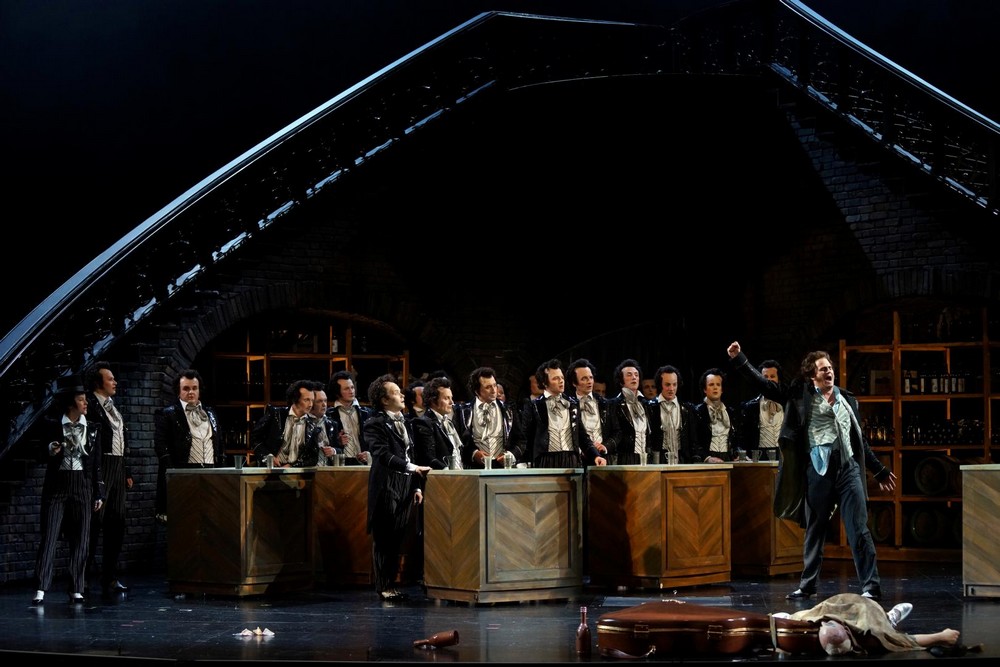 Michael Volle byl přitom pro mne především pěvecky nejlepším představitelem role „zloducha“ z mnoha inscenací této opery, které jsem viděl (snad jen před dávnými lety byl podobně nedostižný James Morris ve Vídeňské státní opeře). Byť je Volle na jevišti takřka neustále, herecky je sebejistý a dokonalý a jeho silný hlas zní po celé představení beze známky únavy – jen v závěrečném nádherně melodickém, ale nesmírně obtížném šansonu Dapertutta Scintille, diamant… zpívá falsetové gis. Byl to nejlepší výkon večera, vedle Hoffmanna Daniela Johanssona. Vzácně vyrovnaní byli ale všichni sólisté. Vedle spolehlivého výkonu orchestru je třeba se ještě jednou vrátit k Pražskému filharmonickému sboru, který právě v tomto Offenbachově díle mohl plně předvést své kvality. Překvapující je hlavně to, že ač nejde o sbor čistě operní, je schopen výtečných hereckých a pohybových kreací. Potěšilo mne také, že dvě menší úlohy byly svěřeny právě členům tohoto sboru Josefu Kovačičovi a Petru Svobodovi. A abych byl s výčtem účinkujících kompletní, musím doplnit úložku Nathanëla ztvárněného Hoël Troadecem. Pod koprodukcí inscenace jsou podepsány vedle bregenzského festivalu operními domy v Kolíně nad Rýnem a Kodani.