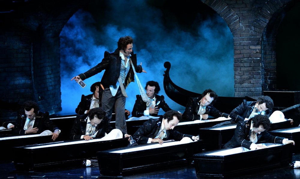 Benátský obraz představuje další Hoffmannovu lásku, kurtizánu Giuliettu, která je ztvárněna sólistkami z předešlých povídek – tedy Kerstin Avemo (Olympia) a Mandy Fredrich (Antonia), přitom ovšem v kostýmu Giulietty se vyskytují dokonce tři dámy. Z několika dějových situací mne zaujalo, jak při Barkarole sluha Franz v Offenbachově podobě pádluje v gondole pod mostem Rialto, u řady rakví s mrtvými ženami klečí naklonovaní Hoffmannové, ve stříbrných šatech a blonďaté paruce se tu prochází Michael Volle, který tak vypadá jako Giulietta. Je těžké popsat všechny ty různé záměny mužů za ženy a naopak, protože je to v této inscenaci dosti časté.