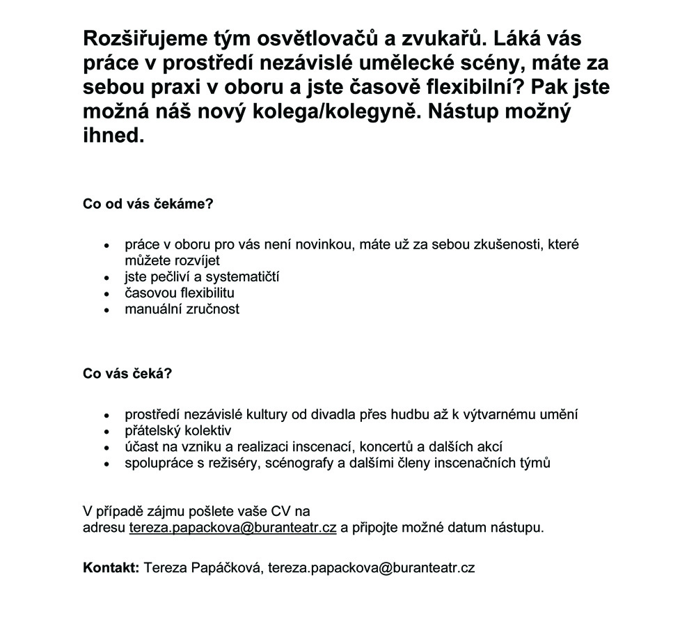 Čtení BuranTeatr rozšiřuje tým osvětlovačů a zvukařů