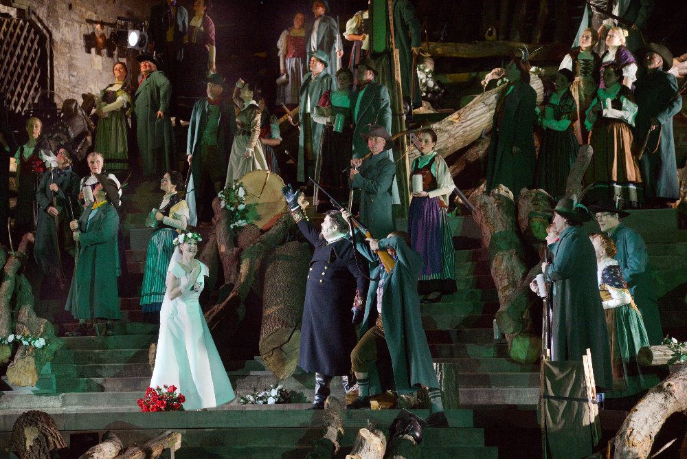 Do půl deváté se tribuna zcela zaplnila. Předehru citlivě podal filharmonický orchestr divadla pod taktovkou hudebního ředitele, dirigenta Samuela Bächliho. Jeviště poté ožilo rozjásaným davem vesničanů v pestrých kostýmech Pierra Alberta, u některých mužů bylo vidět i typické krátké kožené kalhoty s padacím mostem. Při střeleckém klání mezi mysliveckým mládencem Maxem a sedlákem Kyliánem (dobře zpívaným a živě hraným Franzem-Xaverem Schlechtem) dokonce nešťastný Max o své kožené kalhoty dokonce přichází. Polesný Kuno – Gregor Loebel nabádá Maxe, aby se snažil dobře střílet příští den před knížetem, kdy má dokázat, že si zaslouží být povýšen a stát se polesným. Je to Kunova podmínka, aby mohl dostat jeho dceru Agátu za ženu. Za melodie českého valčíku se roztančení vesničané vrací domů. Zůstává nešťastný Max a zpívá svoji velkou árii, při které může ukázat své pěvecké schopnosti jeho představitel, Američan Marc Heller. Ten vládne znělým hutným tenorem s jistými vysokými polohami (připomínám jeho bezproblémového Calafa v Turandot na zdejším jevišti před dvěma lety), byť v lyrických pasážích zůstal své roli něco dlužen. Dostává se do osidel zlověstného Kašpara, muže mohutné postavy ruského basisty Jurije Batukova, který se ukázal jak pěvecky, tak představitelsky vhodným představitelem náročné role. Dostáváme se k dalšímu dějství do myslivny polesného Kuna. K údivu, ale i pobavení publika vyjela zevnitř chrámového rizalitu na úrovni druhé podesty schodiště velká dřevěná konstrukce představující myslivnu (na každé straně stavby byl vycpaný jelen) a v ní místnost se stolem a obrazem na stěně, znázorňujícím Agátina pradědečka, nadlesního Kuna.