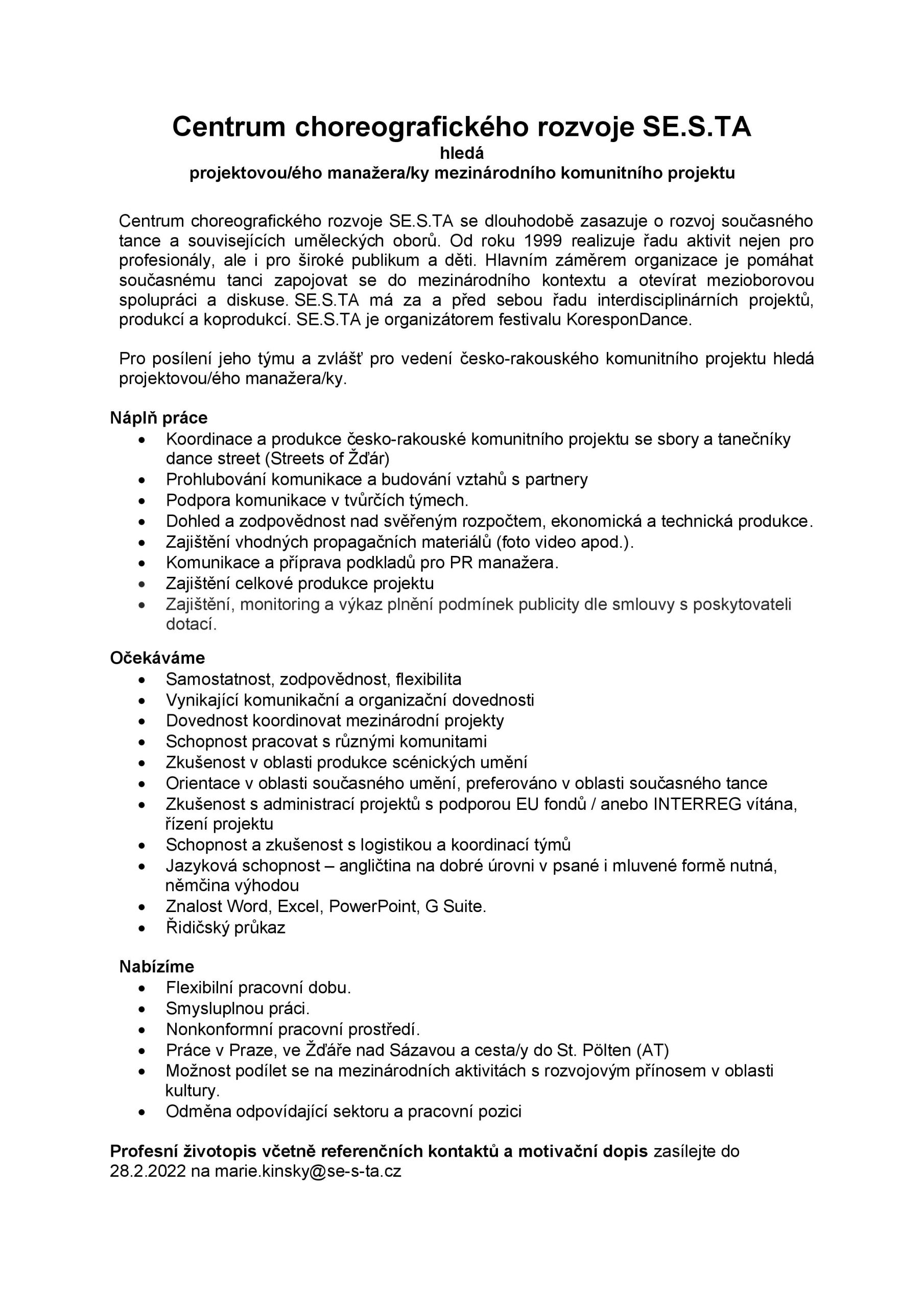 Inzerce Centrum choreografického rozvoje SE.S.TA hledá projektového manažera mezinárodního komunitního projektu Publikováno 21/02/2022 sdílejte: 0 minut čtení sdílejte: TémataSeznam inzerátů Sdílet článek Facebook email zkopíruj odkaz vytisknout sdílejte: Předchozí článek Yuja Wang zahraje s Českou filharmonií Rachmaninova Další článek Festival Prague Proms zahajuje svůj osmnáctý ročník 0 0 hlasy Ohodnoťte článek Odebírat Přihlášení Upozornit na nové a další komentáře nové odpovědi na můj komentář Label {} [+] Jméno* E-mail* Webová stránka Label {} [+] Jméno* E-mail* Webová stránka 0 Komentáře Nejstarší Nejnovější Most Voted Inline Feedbacks Zobrazit všechny komentáře Načíst další