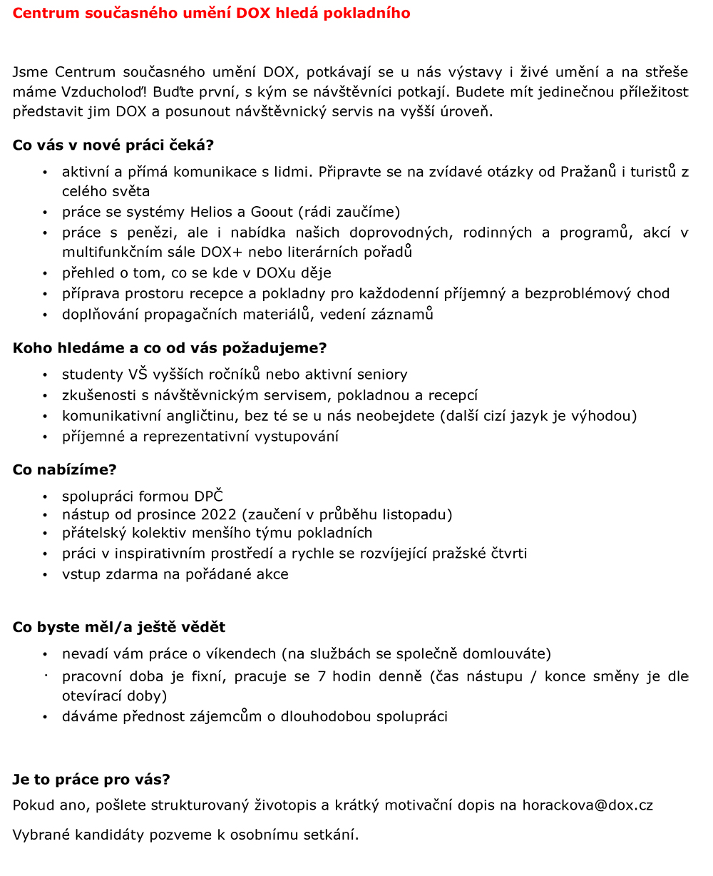 Inzerce Centrum současného umění DOX hledá pokladního Publikováno 04/11/2022 sdílejte: 0 minut čtení sdílejte: TémataSeznam inzerátů Sdílet článek Facebook email zkopíruj odkaz vytisknout sdílejte: Předchozí článek Před 130 lety zemřel „Šílený skladatel“ Hervé Další článek Slovenský filharmonický sbor vystoupí v Berlíně pod vedením Christopha Eschenbacha 0 0 hlasy Ohodnoťte článek Odebírat Přihlášení Upozornit na nové a další komentáře nové odpovědi na můj komentář Label {} [+] Jméno* E-mail* Webová stránka Label {} [+] Jméno* E-mail* Webová stránka 0 Komentáře Nejstarší Nejnovější Most Voted Inline Feedbacks Zobrazit všechny komentáře Načíst další