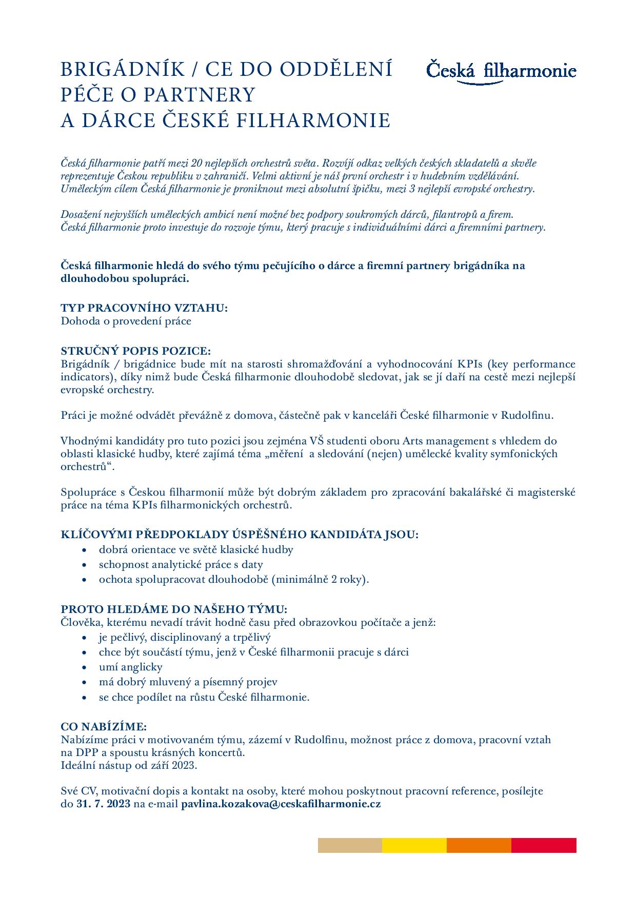 Inzerce Česká filharmonie hledá brigádníka do oddělení péče o partnery a dárce Publikováno 06/07/2023 sdílejte: 0 minut čtení sdílejte: TémataSeznam inzerátů Sdílet článek Facebook email zkopíruj odkaz vytisknout sdílejte: Předchozí článek Bilance festivalu TANEC PRAHA 2023 a pozvánka na letní předpremiéru Yany Reutové Další článek Dramaturgyně Moravské filharmonie Ivana Kalina Tabak: Nesedíme s rukama v klíně 0 0 hlasy Ohodnoťte článek Odebírat Přihlášení Upozornit na nové a další komentáře nové odpovědi na můj komentář Label {} [+] Jméno* E-mail* Webová stránka Label {} [+] Jméno* E-mail* Webová stránka 0 Komentáře Nejstarší Nejnovější Most Voted Inline Feedbacks Zobrazit všechny komentáře Načíst další