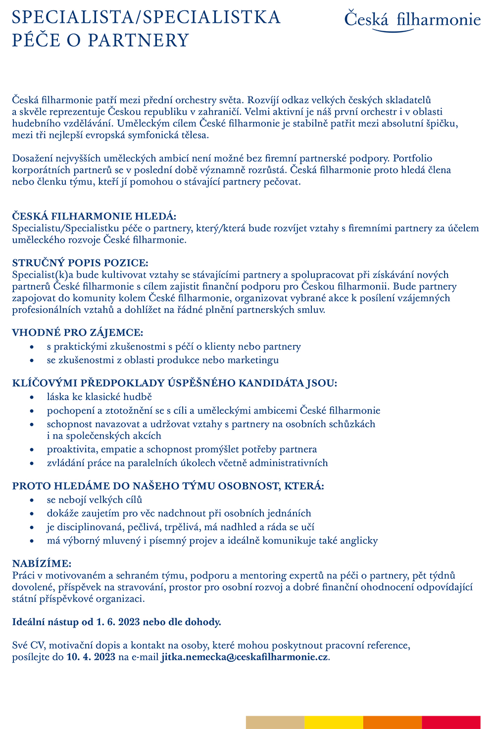 Inzerce Česká filharmonie hledá specialistu péče o partnery Publikováno 25/03/2023 sdílejte: 0 minut čtení sdílejte: TémataSeznam inzerátů Sdílet článek Facebook email zkopíruj odkaz vytisknout sdílejte: Předchozí článek Skladatel Zbyněk Matějů: Necítím se být nějakým privilegovaným autorem Další článek Umělce znepokojuje malá podpora státu 0 0 hlasy Ohodnoťte článek Odebírat Přihlášení Upozornit na nové a další komentáře nové odpovědi na můj komentář Label {} [+] Jméno* E-mail* Webová stránka Label {} [+] Jméno* E-mail* Webová stránka 0 Komentáře Nejstarší Nejnovější Most Voted Inline Feedbacks Zobrazit všechny komentáře Načíst další