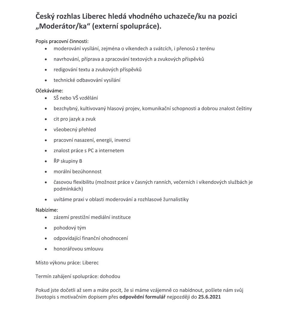 Inzerce Český rozhlas Liberec hledá moderátora Publikováno 09/06/2021 sdílejte: 0 minut čtení sdílejte: Odpovědní formulář naleznete zde. TémataSeznam inzerátů Sdílet článek Facebook email zkopíruj odkaz vytisknout sdílejte: Předchozí článek Cirk-UFF: Na hladině a nad střechami Další článek Orchestry Národního divadla a Státní opery vystoupí na otevřené palubě lodi 0 0 hlasy Ohodnoťte článek Odebírat Přihlášení Upozornit na nové a další komentáře nové odpovědi na můj komentář Label {} [+] Jméno* E-mail* Webová stránka Label {} [+] Jméno* E-mail* Webová stránka 0 Komentáře Nejstarší Nejnovější Most Voted Inline Feedbacks Zobrazit všechny komentáře Načíst další