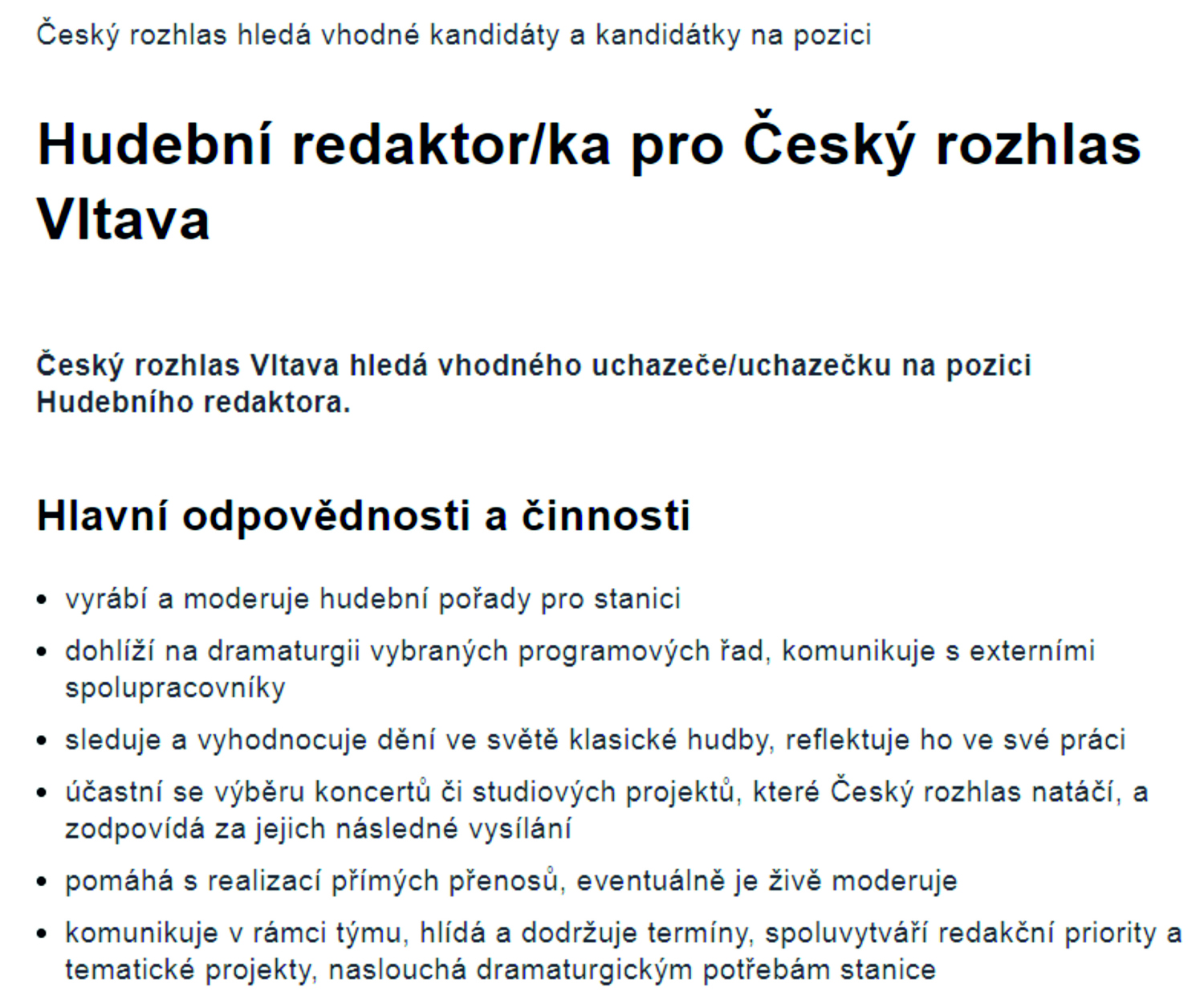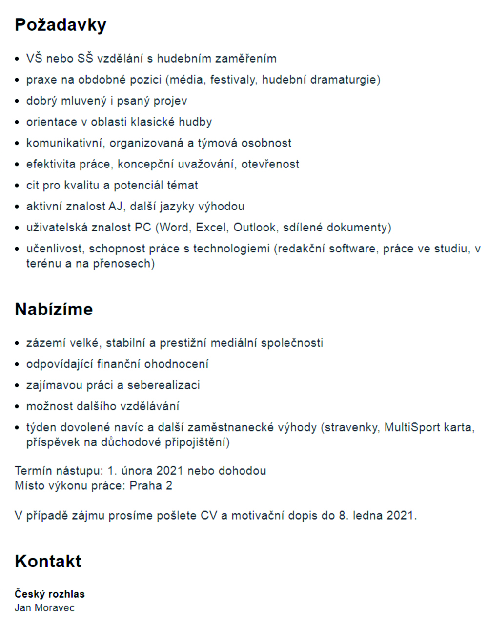 Inzerce Český rozhlas Vltava hledá hudebního redaktora/ku Publikováno 21/12/2020 sdílejte: 0 minut čtení sdílejte: TémataSeznam inzerátů Sdílet článek Facebook email zkopíruj odkaz vytisknout sdílejte: Předchozí článek Týden s hudbou. Vánoce se streamy z Metropolitní opery Další článek Operní panorama Heleny Havlíkové (299) – Zahájení ve Scale bez diváků v hledišti 0 0 hlasy Ohodnoťte článek Odebírat Přihlášení Upozornit na nové a další komentáře nové odpovědi na můj komentář Label {} [+] Jméno* E-mail* Webová stránka Label {} [+] Jméno* E-mail* Webová stránka 0 Komentáře Nejstarší Nejnovější Most Voted Inline Feedbacks Zobrazit všechny komentáře Načíst další