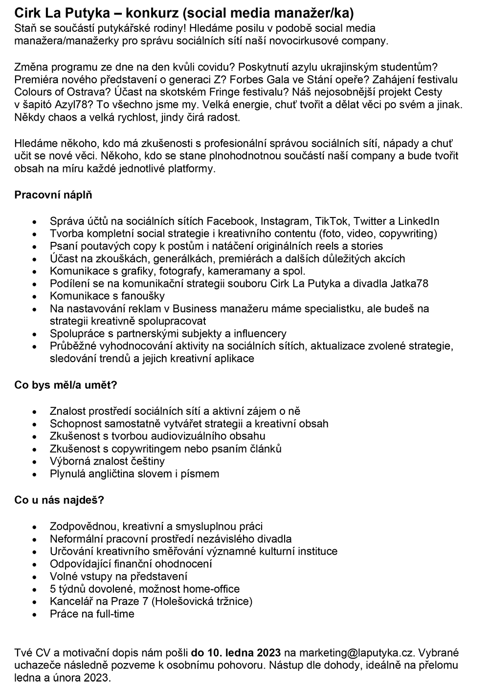 Inzerce Cirk La Putyka hledá posilu v podobě social media manažera Publikováno 23/12/2022 sdílejte: 0 minut čtení sdílejte: TémataSeznam inzerátů Sdílet článek Facebook email zkopíruj odkaz vytisknout sdílejte: Předchozí článek Slovenský filharmonický sbor vystoupí na závěr roku ve Stuttgartu Další článek Poutníci po temnotách lidské duše 0 0 hlasy Ohodnoťte článek Odebírat Přihlášení Upozornit na nové a další komentáře nové odpovědi na můj komentář Label {} [+] Jméno* E-mail* Webová stránka Label {} [+] Jméno* E-mail* Webová stránka 0 Komentáře Nejstarší Nejnovější Most Voted Inline Feedbacks Zobrazit všechny komentáře Načíst další