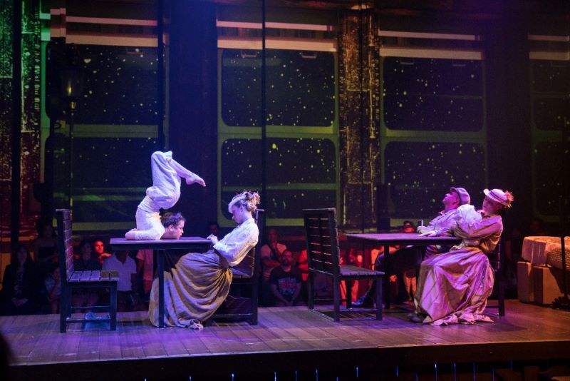 Některé přechody mezi divadelními výstupy a cirkusovými čísly vyřešili tvůrci naprosto fantasticky, jako například napojení příběhu o zavedení telegrafu na disciplínu vertikální lano (Cléa Perion), anebo balancování na jízdním kole (Alexis Bernatchez) v případě doručovatelů telegramů a vzpomínku na počátky elektřiny podpořili vzdušnou akrobacií na neukotvené pouliční lampě (Kaitlyn Mussio). Současně nástupy performerů ze všech možných stran i z bezprostřední blízkosti diváků, zvolání z různých koutů prostoru, oči absorbující videoprojekce, melodie a asociativně podpůrné ruchy dokázaly odůvodnit i méně šikovná tranzitní řešení pro posun v ději.