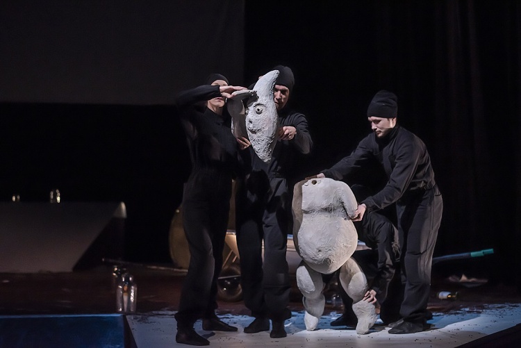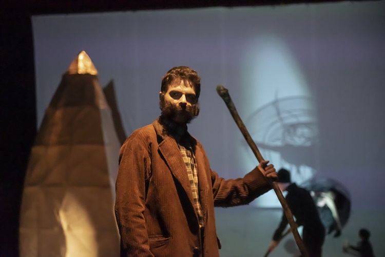 Nejdřív jsme chtěli na zem položit skutečnou hlínu. Divák vejde, ucítí vůni hlíny a okamžitě je v přírodě. Nádhera. Ale pak jsme zjistili, že hlína práší. Museli bychom ji hodně kropit a udělali bychom z toho bahýnko. Krom toho by musela být ošetřena drahým nástřikem proti červotočům. Hledali jsme jiný materiál, až jsme našli korek, který bohužel skřípe. Hlína by tak příjemně ševelila. Dráždí nás to, ale zatím nevíme, co s tím. Jinak ve scénografii používáme přírodní materiály. Veškerá hrabla jsou ze dřeva; boky, šikmy i propadlo mají žebroví z černých klacků. To byl pokus scénografů ukázat žebra velryby, ale mohou to být i zkameněliny nebo větve.
