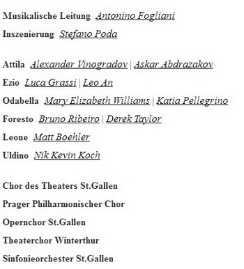 ===Do velkolepého provedení tohoto Attily byly zapojeny hned čtyři sbory. Náš Pražský filharmonický sbor je přitom v St. Gallenu pravidelným hostem již od prvního ročníku festivalu v roce 2006, kdy přednesl sborový part ve scénickém, hudebně-tanečním nastudování Carmina Burana Carla Orffa. V dalších letech účinkoval v představeních Saint-Saënsova Samsona a Dalily, při ojedinělém uvedení Donizettiho opery Potopa světa a v inscenaci Verdiho rané opery Lombarďané na první křížové výpravě, v loňském roce pak ve scénickém provedení Faustova prokletí Hectora Berlioze. Obsazení letošního Attily: