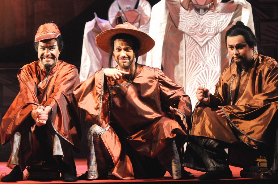 V titulní roli se představila Ivana Šaková ve velmi dobré formě. Vnitřně procítěným výkonem s krásně klenutými legatovými frázemi se prezentovala v roli Liu Petra Šimková – Alvarez. Basista Jevhen Šokalo byl v tomto památném večeru imponujícím Timurem. Výborné trio ministrů Pinga, Panga a Ponga představovali mladí, velmi talentovaní pěvci Jiří Hájek, Richard Samek a Ondřej Socha. Barytonista Jiří Hájek si širokodeché fráze Pucciniho doslova vychutnával. Líbila se mi pružnost a modulační schopnost jeho tvárného hlasu, schopného dynamicky jemných odstínů. Rovněž Richard Samek po večeru v titulní roli Fausta si užíval svůj part ministra. Jeho hlas zněl svěže a barevně. Celé trio bylo sezpívané a sehrané příkladně. Již jsem to psal loni, ale musím to zopakovat. Tak výrazné trio ministrů se v Turandot často nevídá a neslýchá.