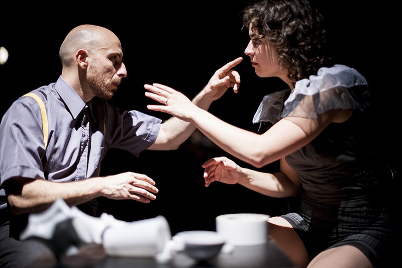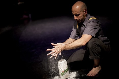 V přední části divadelního prostoru je umístěn stůl s různými předměty a židle. Tanečníci se kolem nich pohybují, natahují po předmětech ruce, ale nikdy se jich nedotknou. Kam zapadá tento motiv? Je snad symbolickým začátkem cesty k doteku? Ale to by se nesměl objevit až uprostřed inscenace. Tanečníci se nakonec dotýkají i sami sebe a nejsilněji zapůsobí duet vycházející z kontaktní improvizace, kdy se snaží zůstat stále v pohybu, ale přitom se co největší plochou těl vzájemně dotýkat. Takové slibné scénky či výjevy jsou však rychle ukončovány a nerozvíjejí se dále. I závěrečný obraz, v němž si oba otevřou sáček s moukou a nabílí ruce a obličeje – právě tím končí. Přitom vzbuzuje v kontextu divadla tolik asociací. Nakonec to spíš vypadá, že autoři nevěděli, jaký vymyslet celému dílu konec, aby divák pochopil, že skutečně konec je…