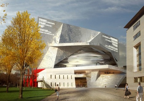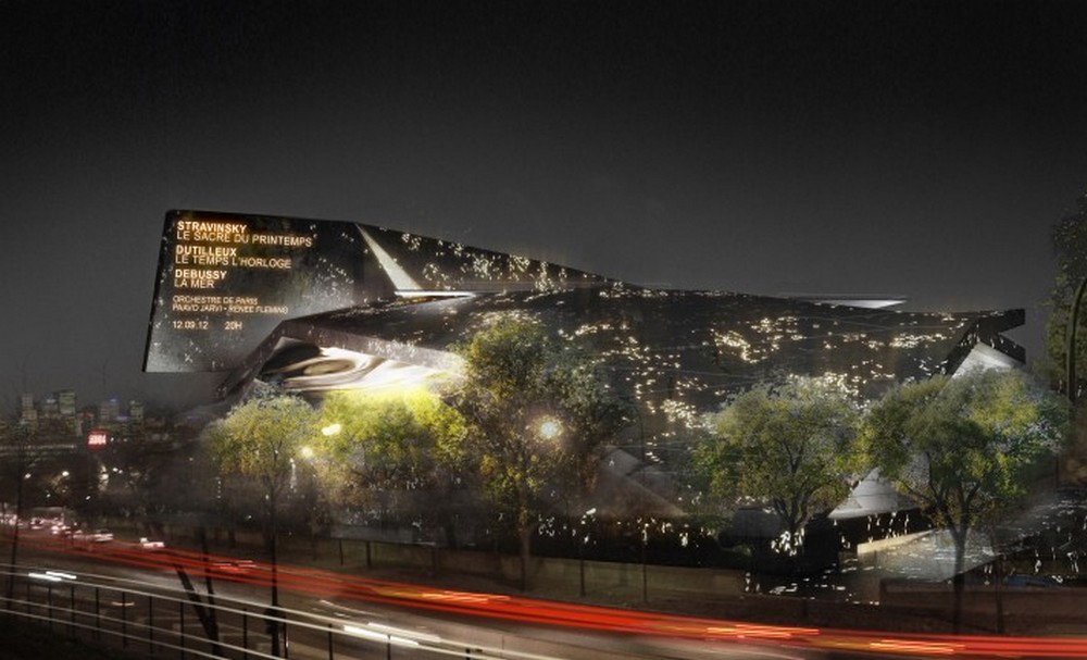 Mohutná příjezdová rampa jako součást stavby nové koncertní budovy a současně součást dálničního okruhu organicky spojuje právě komunikaci a budovu. Budova navíc vnějším pláštěm ze surového betonu dálniční rampy a přejezdy evokuje. Vrstvy pater ze surového betonu se prolínají a zdánlivě připomínají desky dálničních nadjezdů. Strohá šeď betonu je „rozbita“ dvěma ocelovými přístavky, ve kterých jsou výtahy a schodiště z úrovně parku, a červenými nápisy na betonové věži provaziště. Hlavní vnitřní sál však ostře kontrastuje s pravoúhlou surovou vnější architekturou. Oválný sál má dvě patra a orchestřiště je umístěno v místě zlatého řezu. Strop má osvětlení skryté do klenutých a ladných křivek podhledů, které jsou v přímém rozporu se strohostí vnějšího vzhledu budovy. I přes slib prezidenta Nicoly Sarkozyho, že práce po revizi rozpočtu a navržení úspor (oproti odhadovanému rozpočtu z roku 2007 se mělo po revizi projektu uspořit více než sto padesát čtyři milionů dolarů) započnou v roce 2011, se tak doposud nestalo.+++