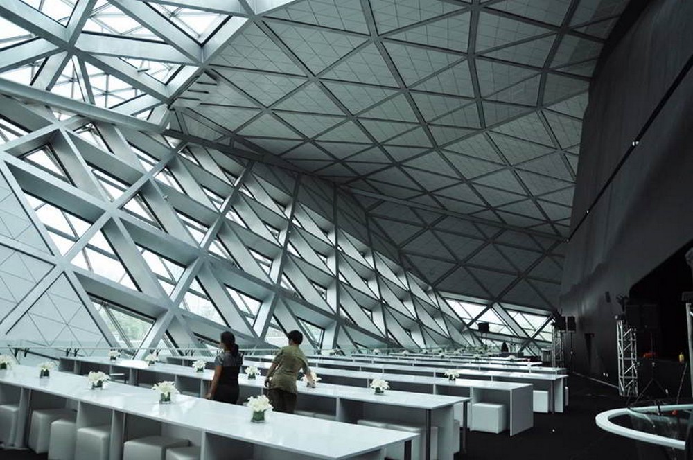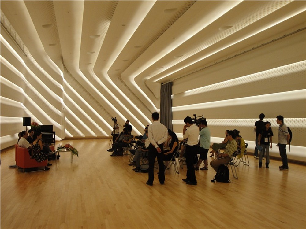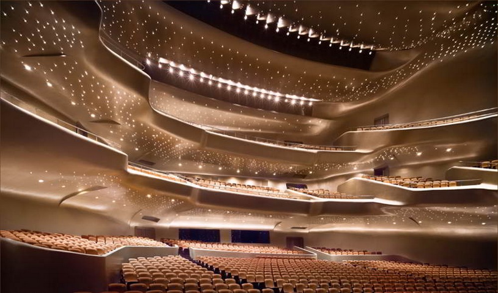=== Jakmile vstoupíte do hlavního sálu, máte pocit, jako byste vstoupili do útrob jícnu nějakého obrovského ještěra. Aerodynamické kontury sálu nejsou narušeny vůbec ničím. Ani balkony po stranách nejsou visuté a jsou součástí hladkých ploch a křivek. Celistvosti a dojmu z absolutní nenarušenosti ploch přispívá i to, že stěny provedené ze světle béžového sádrokartonu skrývají i veškerá technická zařízení. Světla, vzduchotechnika… vše je součástí hladkého jednolitého prostoru tvořeného systémem křivek. Krom toho nezvyklý dojem vyvolává i to, že prostor není symetrický. Z hladké křivky stěn hlavního sálu jako kapsy vystupují balkony. Nepravidelné a nestejnoměrně dlouhé. Balkony zde hrají i důležitou akustickou roli. Hladké a plynulé přechody v hlavním sále by nezaručovaly dobrou akustiku, proto balkony slouží jako zvukové překážky. Sál tak má špičkovou akustiku. Celá stavba byla otevřena představením opery Turandot. A už po prvním představení prohlásil britský hudební recenzent Ken Smith, že „akustika sálu je do té doby neslýchaným prolnutím vrstev zvuku orchestru, pěvců, sboru i sólistů, které se dokonale prolínají, ale zároveň jsou slyšet odděleně.“+++