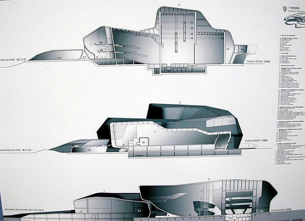 ===Londýnská pobočka architektonického ateliéru Zaha Hadid navrhla stavbu jako monolitickou bez výrazných ostrých hran a přechodů. Stavba tak kontrastuje s dvěma výškovými budovami, které jsou dominantou čtvrti. Dvoupatrový komplex působí velmi kompaktním dojmem a plynulé přechody zakřivených stěn fasády jsou inspirovány bezobratlými mořskými živočichy a velmi souzní s parkem, ve kterém je budova umístěna. Komplex obsahuje hlavní operní sál pro 1 800 diváků a multižánrový menší sál pro 440 lidí. Součástí veřejně přístupných prostor jsou i kavárny, restaurace a nákupní galerie, které oživují komplex i v době, kdy se nekonají žádná představení. Hladké křivky komplexu, působící živočišně uklidňujícím dojmem zvenku, se promítají i do interiéru. Vlastně je to tak, že skořepina stavby složená z ladných křivek je přiznána i v interiéru. Zatímco konstrukci z ocelových ohýbaných profilů zvnějšku zakrývá šedé mramorové obložení a sklo, zevnitř ve foyeru a provozních prostorech je konstrukční ocel přiznaná. Monumentální vstupní foyer je proveden v bílé barvě a je otevřený přes celou výšku budovy. Z balustrád sousedících se zadní stěnou hlavního operního sálu je možné přehlédnout nejenom celý vnitřní prostor foyeru, ale také získat krásný výhled do parku a na Perlovou řeku.+++