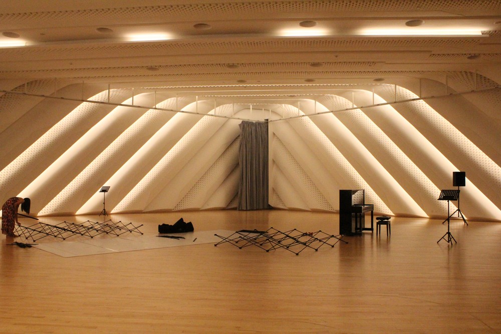 ===Součástí komplexu je také baletní zkušební sál. Jeho vnitřní vzhled působí jako kostra ještěra. A jako kontrast k hladkým křivkám stěn hlavního operního sálu působí i strohá technicistní podoba multižánrového sálu, který má přiznané osvětlovací rampy i technické zázemí. Aby ho bylo možné využít k mnoha různým účelům, jsou sedadla mobilní a celé podlahové panely se dají odkrývat, přemisťovat a natáčet.+++