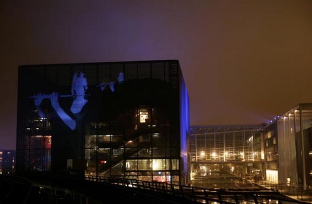 Stejně tak je sklem pokrytý i foyer zevnitř, podobně se i na jeho skleněné stěny v interiéru promítají abstraktní projekce. Tím dochází k propojení dojmu z vnějšího provedení budovy, z jejího exteriéru a interiéru. Foyer je otevřený čtyřiadvacet hodin denně a nabízí lidem nejenom možnost posedět uvnitř za špatného počasí, zakoupit si lístek na koncert, ale také navštívit restauraci nebo bar.Je to architektura plná překvapení: Projekce vně i uvnitř budovy, sklo je v kontrastu s neopracovaným hrubým betonem schodišť a některých zdí foyeru. Visuté eskalátory v šesti podlažích, podlahy z galvanizované oceli, v pastelových barvách vyvedené části podhledů stropů a stěn a červené interiéry provozní části – i to je velmi neobvyklé.