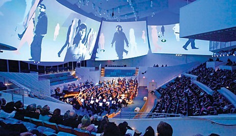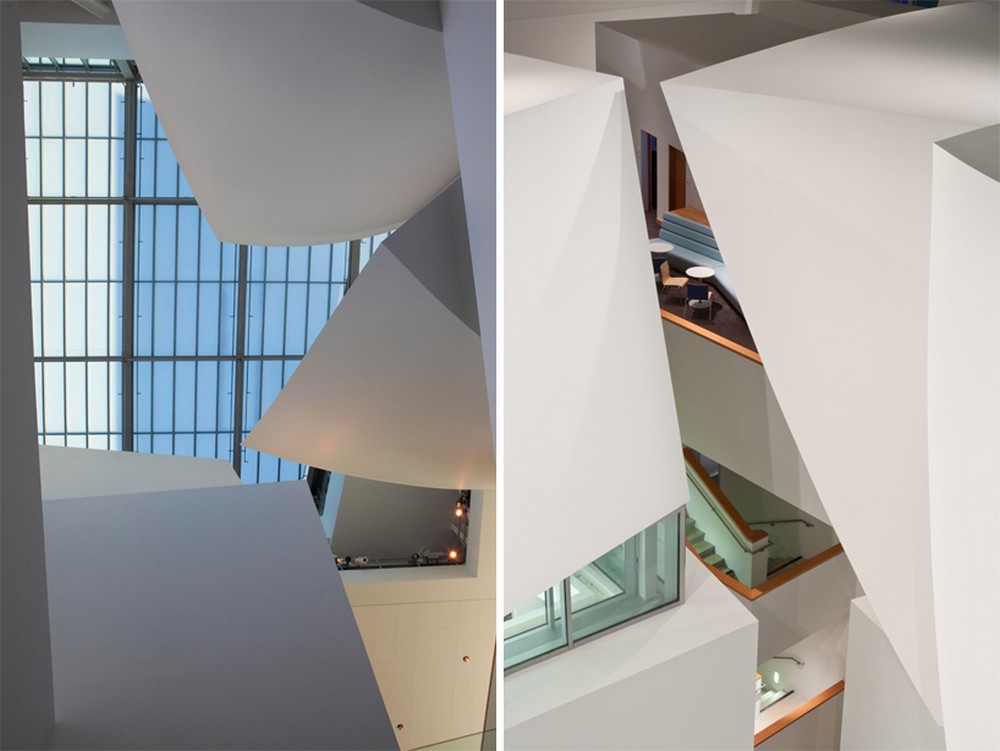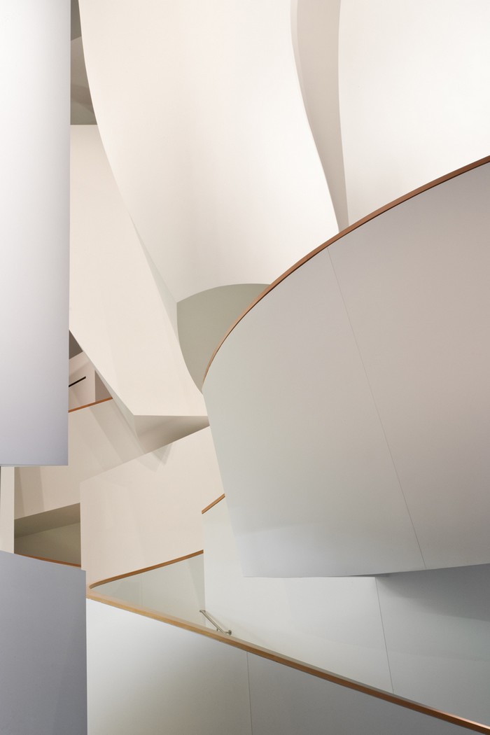 Pohyb ve vzdušném atriu budovy o šesti poschodích s monumentálním spirálovitě zatočeným schodištěm v čistě bílé je okouzlující. Ve všech částech budovy jsou prakticky rozmístěny zkušebny provozní místnosti a jihovýchodním směrem je umístěn vlastní koncertní sál. Interiér sálu je na rozdíl od víceméně obdélníkového půdorysu jiný. Architekt Géry přišel s dnes již zapomenutým konceptem uspořádání sálu italského Teatro Olympico (prvního novodobého divadla). To vše ale v provedení jednadvacátého století.