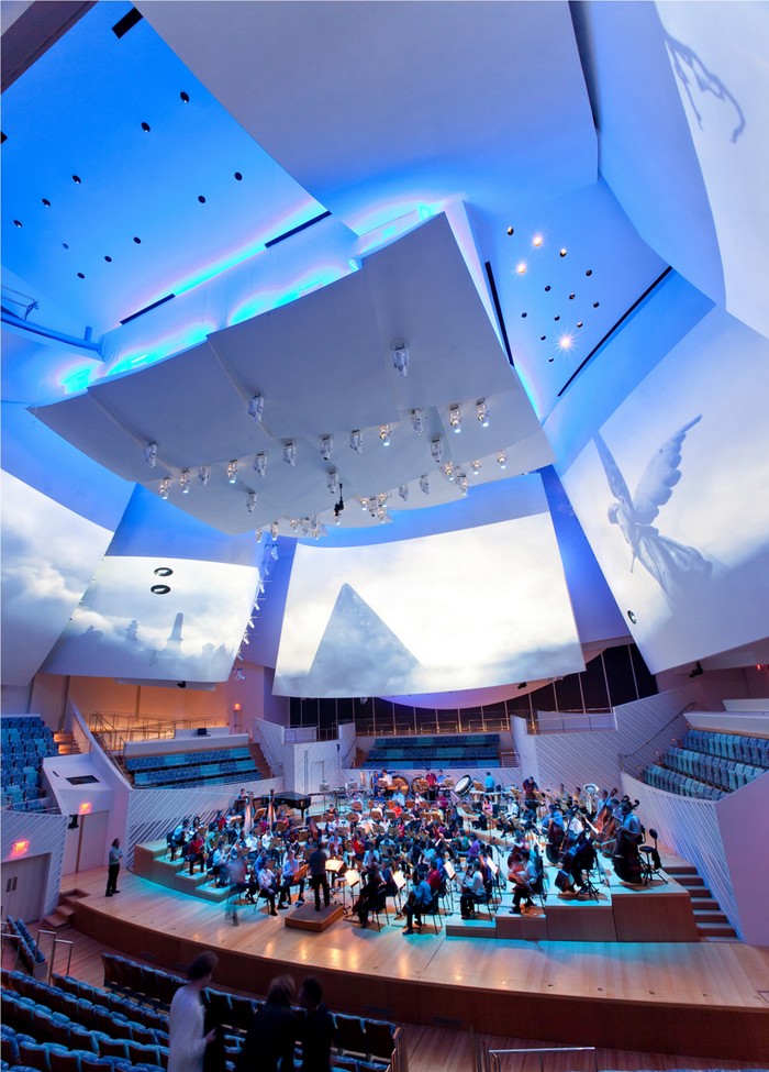 Dirigent Michael Tilson Thomas podporoval tuto vizuální podobu a zároveň se také spolupodílel na akustické podobě sálu. Vznikl tak sál, který je akusticky vhodný pro provozování symfonické hudby stejně dobře jako pro provozování hudby komorní. Díky balkónům, které jsou zčásti uzpůsobeny nikoli pro diváky, ale pro účinkující, sál umožňuje i velmi působivé koncertní provedení oper nebo muzikálů, kdy sbory a účinkující stojí na podkovitě zaoblených podestách balkónů, a obkopují tak obecenstvo v prostoru a vytvářejí neobvyklý poslechový zážitek. Sál umožňuje přes čtyřicet konkrétních uspořádání, která se přizpůsobí každému stylu provozované hudby, včetně hudby moderní. Současně je koncertní budova jednou z nejlepších akustických síní světa.