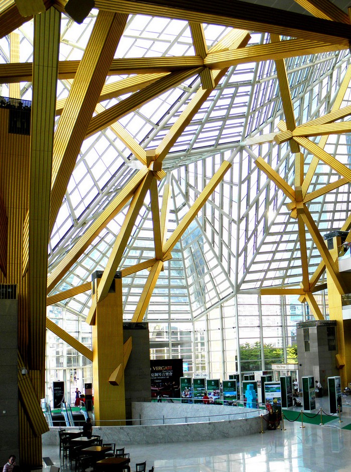 V roce 1998 vyhrál architekt Arata Isozaki mezinárodní soutěž na stavbu městské koncertní síně a knihovny, dvou částí nově vznikajícího shenzenského kulturního centra. Isozaki umístil třípodlažní budovu Shenzhen Concert Hall (深圳音樂廳) na vyvýšenou platformu a její dvě části rozpoltil jakýmsi „průsmykem“ – průchodem s nelineárně sešikmenými stěnami ze skla a oceli. Jižní část takto rozdělené budovy obsahuje knihovnu, severní pak koncertní sál. Obě části spojuje prosklený průchod právě v místech „průrvy“.