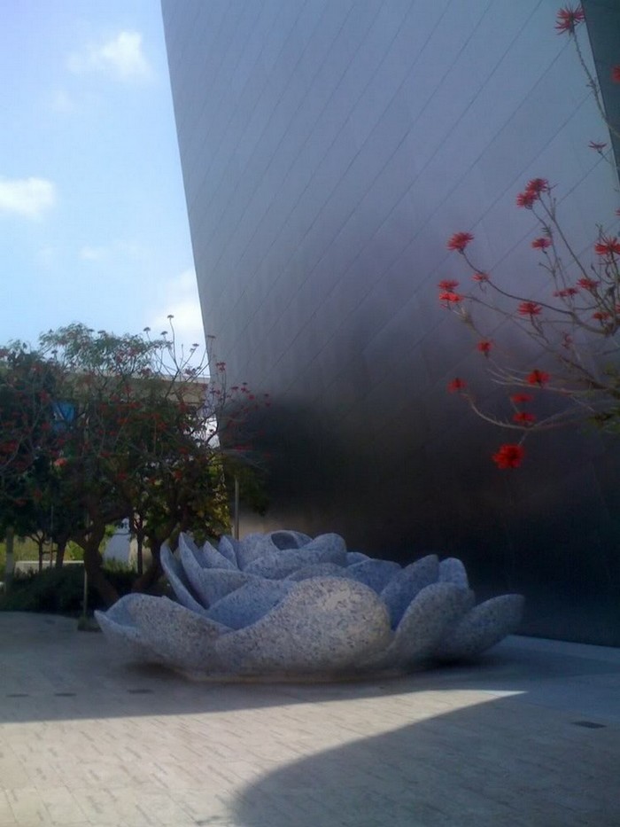 Přestože se o budově Walt Disney Concert Hall hovoří jako o aerodynamické architektuře, výsledná podoba budovy je také evokována přírodou: motivem rozevírajícího se květu. To je patrné jak při pohledu na budovu zvenčí z mírného nadhledu okolních mrakodrapů, tak na vnitřním uspořádání hlavního sálu. Pro dokonalý aerodynamický vnější vzhled byl zvolen jako obklad velké části budovy leštěný nerezový plech, vyklenutý do exponenciálních ploch s plynulými přechody. Tyto křivky se velmi plynule z exteriéru přenášejí i do interiéru foyeru a navazují na geometricky velmi přímočarou hlavní část budovy, zahrnující hudební sál a jeho zázemí. Ta je vyklenutá vysoko nad zakřivené části fasády, blyštící se ve slunečním svitu ve tvaru dvou spojených prosklených, kónicky se k zemi zužujících kvádrovitých věží.