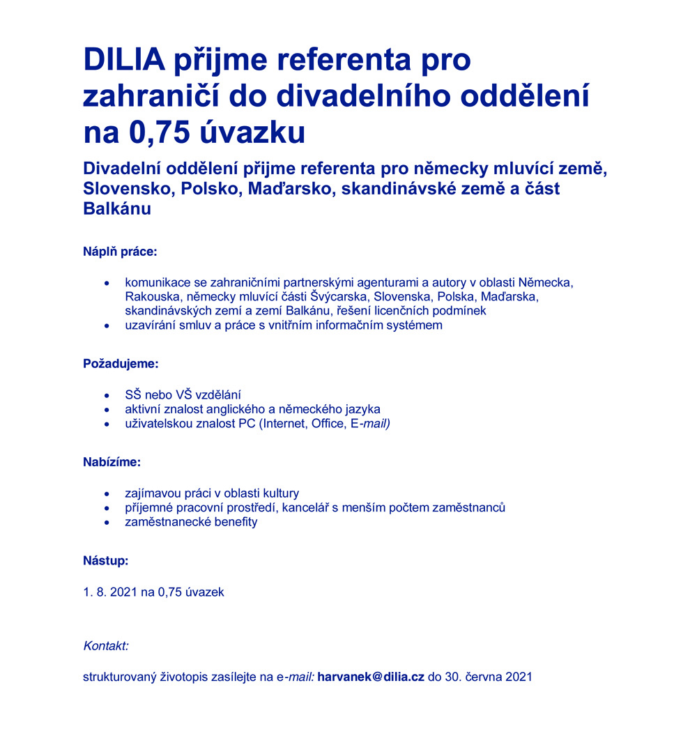 Inzerce Dilia přijme referenta pro zahraničí do divadelního oddělení Publikováno 20/06/2021 sdílejte: 0 minut čtení sdílejte: TémataSeznam inzerátů Sdílet článek Facebook email zkopíruj odkaz vytisknout sdílejte: Předchozí článek Na břehu Vltavy se rozléhal potlesk opeře Národního divadla Další článek Plzeň má znovu Čajkovského Šípkovou Růženku 0 0 hlasy Ohodnoťte článek Odebírat Přihlášení Upozornit na nové a další komentáře nové odpovědi na můj komentář Label {} [+] Jméno* E-mail* Webová stránka Label {} [+] Jméno* E-mail* Webová stránka 0 Komentáře Nejstarší Nejnovější Most Voted Inline Feedbacks Zobrazit všechny komentáře Načíst další