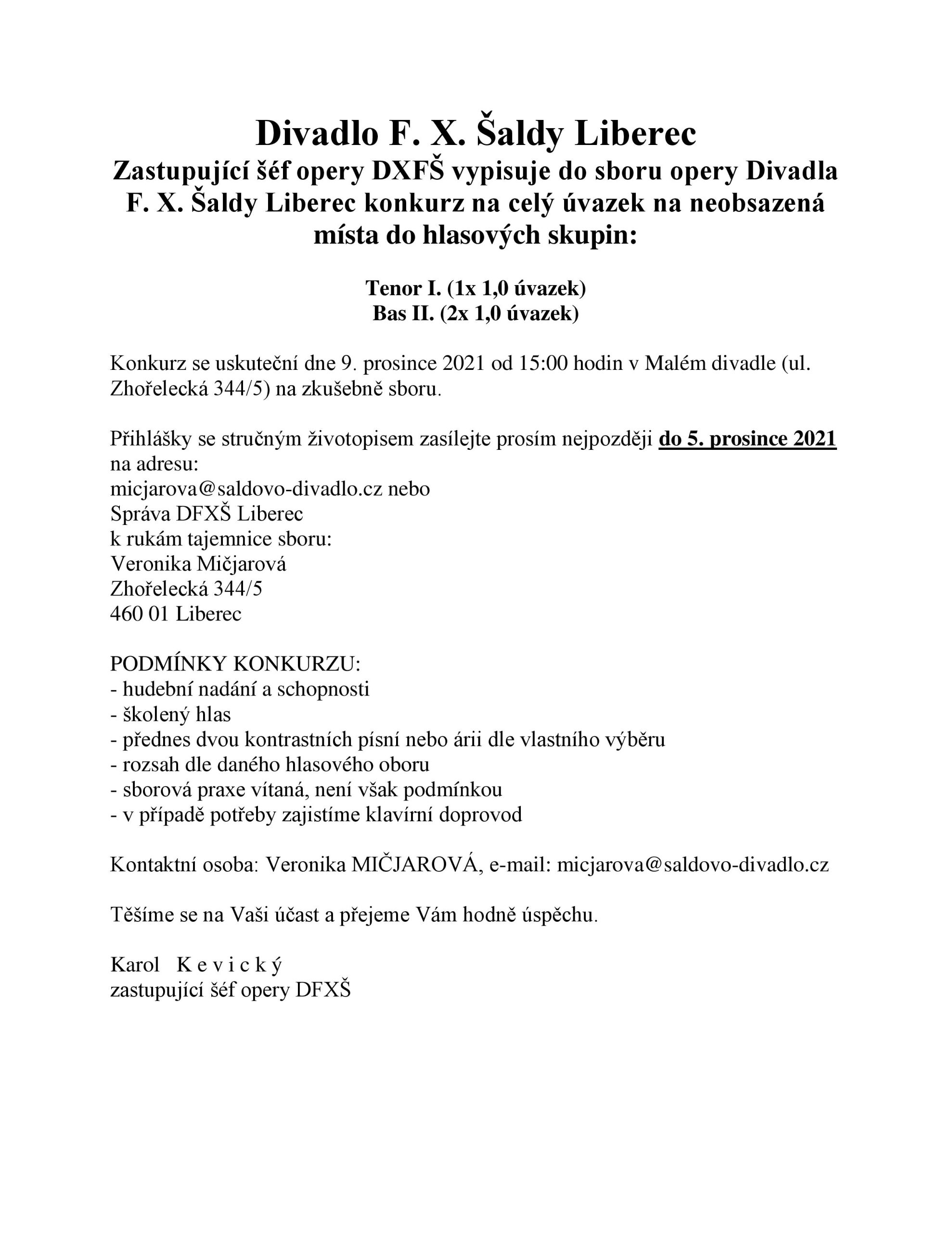 Inzerce Divadlo F. X. Šaldy Liberec vypisuje konkurz do hlasových skupin Tenor I. a Bas II. Publikováno 29/11/2021 sdílejte: 0 minut čtení sdílejte: Repertoárový list ke konkurzu do sboru DXFXŠ Liberec ke stažení zde. TémataSeznam inzerátů Sdílet článek Facebook email zkopíruj odkaz vytisknout sdílejte: Předchozí článek Láska očima nejmladších choreografů Další článek Již známe vítěze soutěže Nadace Bohuslava Martinů 0 0 hlasy Ohodnoťte článek Odebírat Přihlášení Upozornit na nové a další komentáře nové odpovědi na můj komentář Label {} [+] Jméno* E-mail* Webová stránka Label {} [+] Jméno* E-mail* Webová stránka 0 Komentáře Nejstarší Nejnovější Most Voted Inline Feedbacks Zobrazit všechny komentáře Načíst další